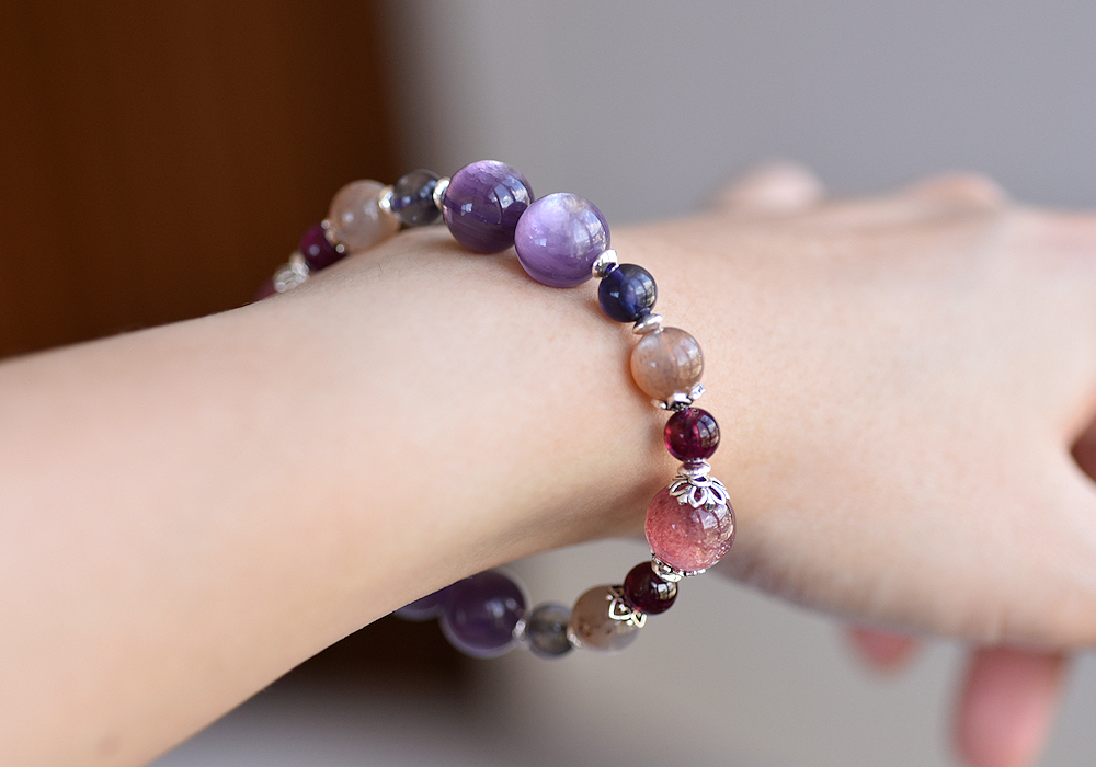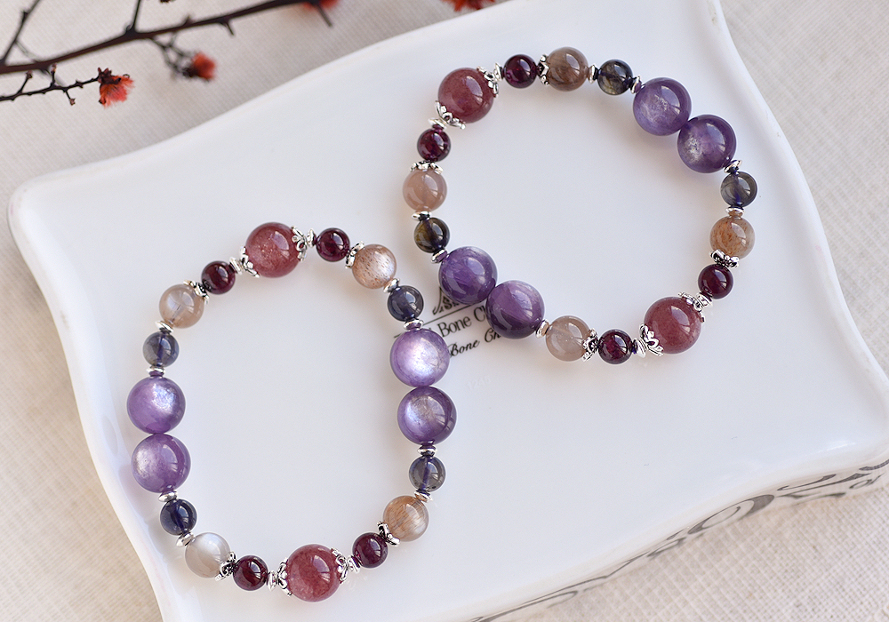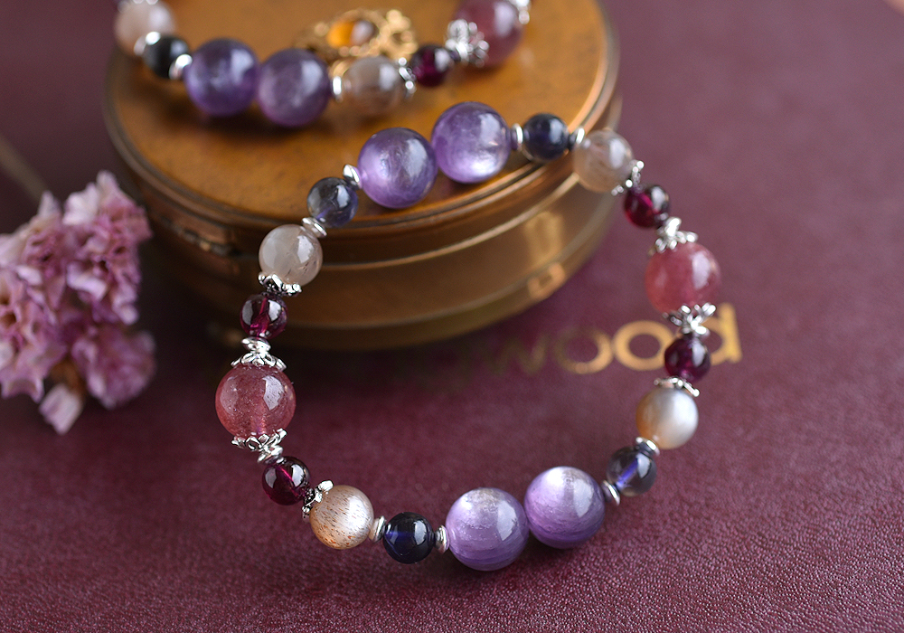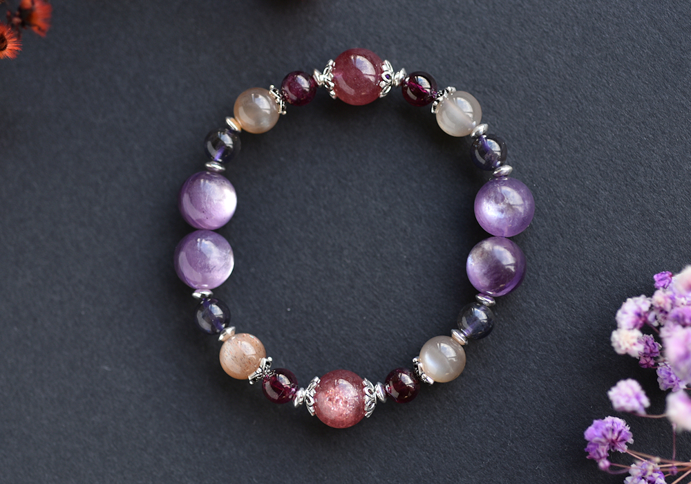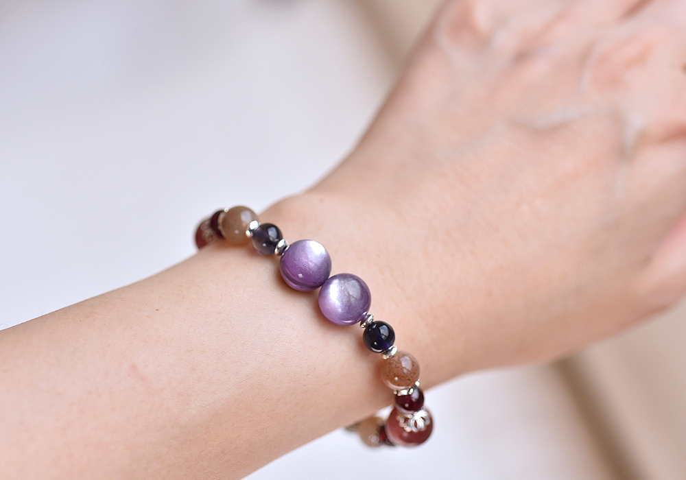 **紫鋰雲母+草莓晶+堇青石+奶茶色太陽石+石榴石+純銀水晶手鍊**