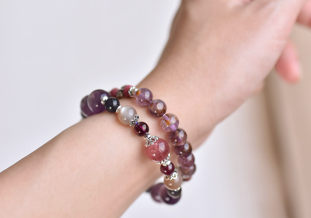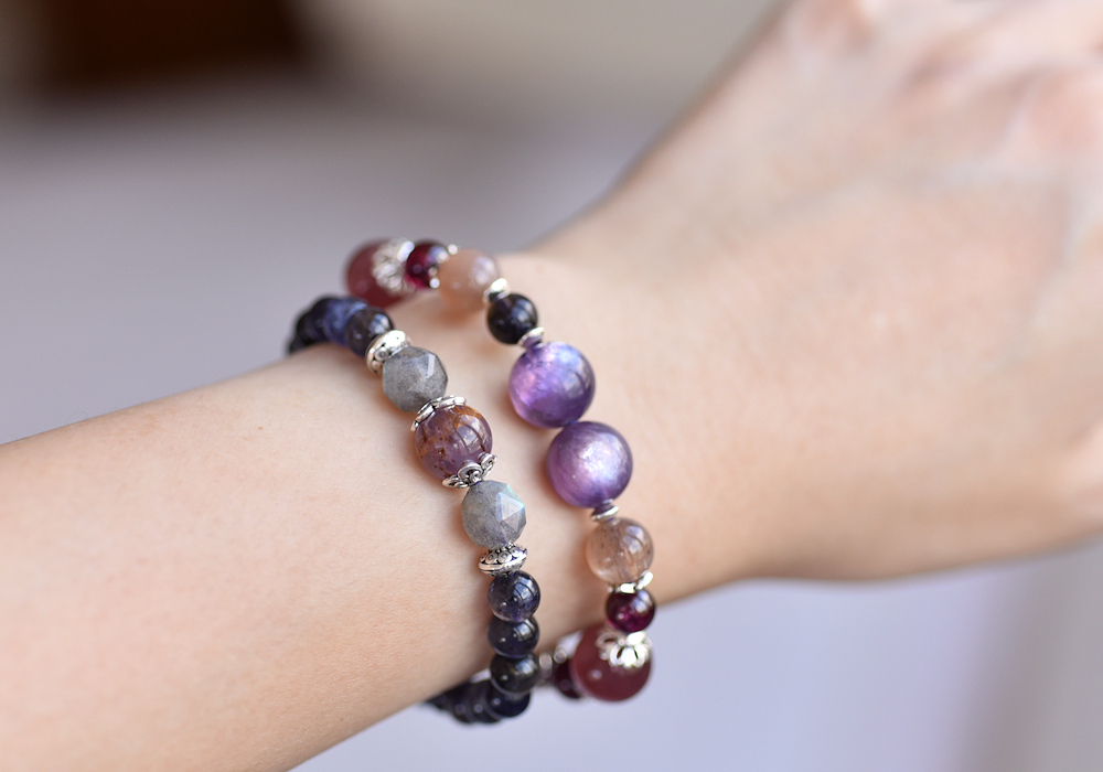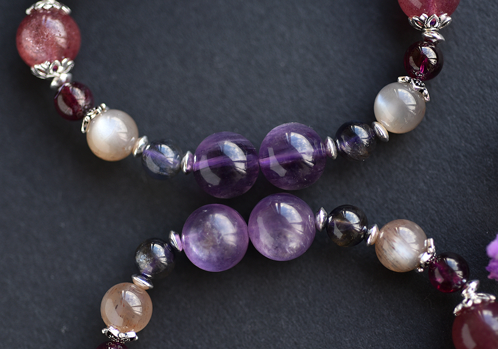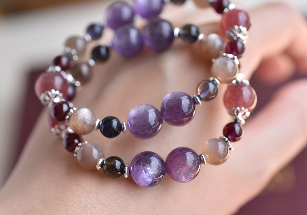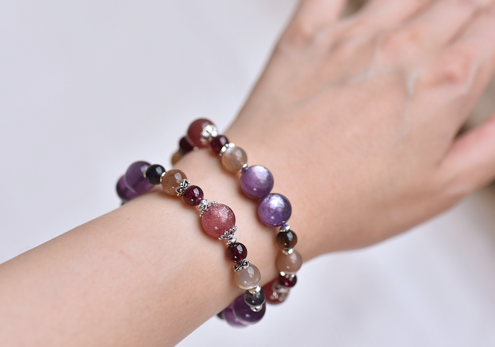 **紫鋰雲母+草莓晶+堇青石+奶茶色太陽石+石榴石+純銀水晶手鍊**