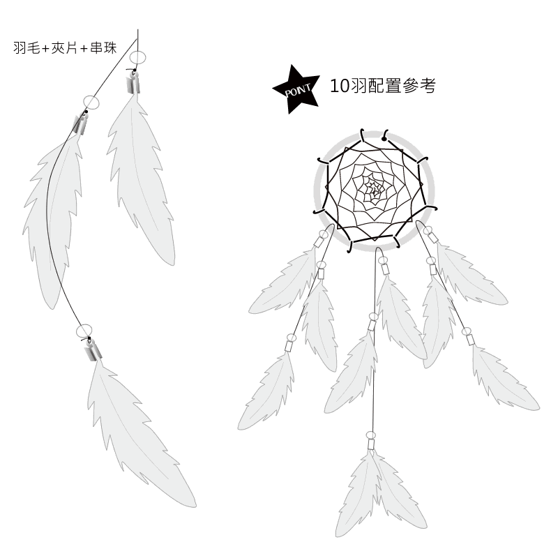 ※ 因雙色繞絨繩有點難度,所以您收到的材料包內已經是繞好絨繩的塑膠圈,只要編網子和綁羽毛即可。