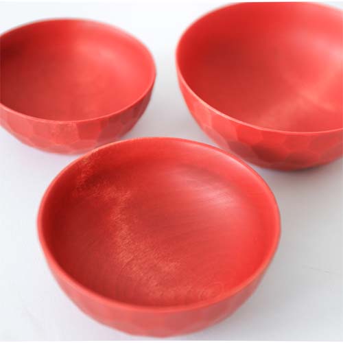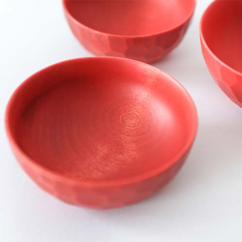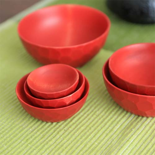 商品名稱中的「套組式」指的是擁有相同形狀大小卻不同的容器,並能夠按照順序將彼此套裝起來。若要說「套組式」最有名的物品,應該就是俄羅斯娃娃吧。這款作品就有如圓圓的可愛俄羅斯娃娃一樣,木碗的直徑從最小的4.5cm開始,每個碗的直徑都會逐漸增加1cm,總共有6個尺寸。這些不同尺寸的碗也都能按照順序漂亮堆疊起來。由於有著各種尺寸,能因應客人的不同需求選擇不同的運用方式。像是當媽媽在廚房燒菜煮飯的時候,也能將戒指暫時放在碗中避免遺失,不論您想要如何運用,相信這款作品一定都能漂亮達成您所交予的任務。