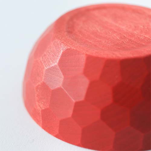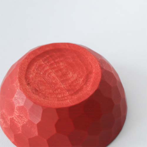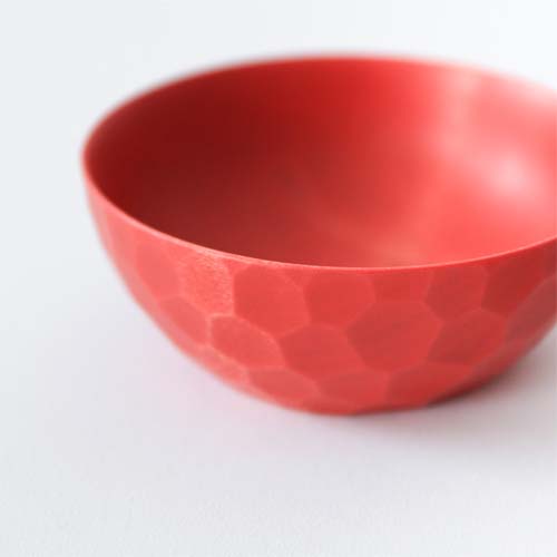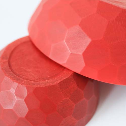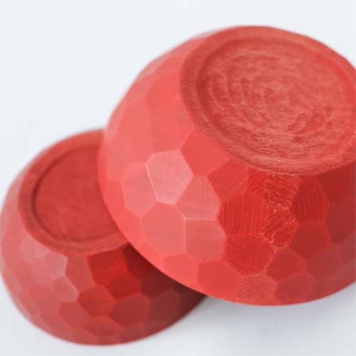 正因為擁有家具城鎮旭川的自豪紮實技術,才有辦法打造出這種完美的圓形。由於採用的是不靠精密工具的手工削切方式進行加工,因此作品的表面會留下有如雕刻的痕跡。這種紋路不只能讓人拿取的時候不易滑手,同時也具有高度的設計感,藉著反射光線讓表面產生一閃一閃的的光澤。這款餐碗是以一整塊木塊鑿製而成的作品,因此完成的木碗不但沒有任何接痕也不易破損,同時能讓觸感得以完整滑順。更重要的是能讓人感受到機械製品所沒有的溫度感。