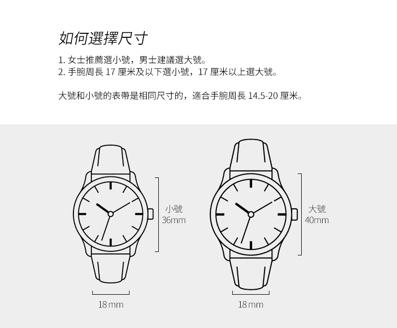 兩款尺寸的表帶是相同的,適合手腕周長14.5-20公分佩戴。