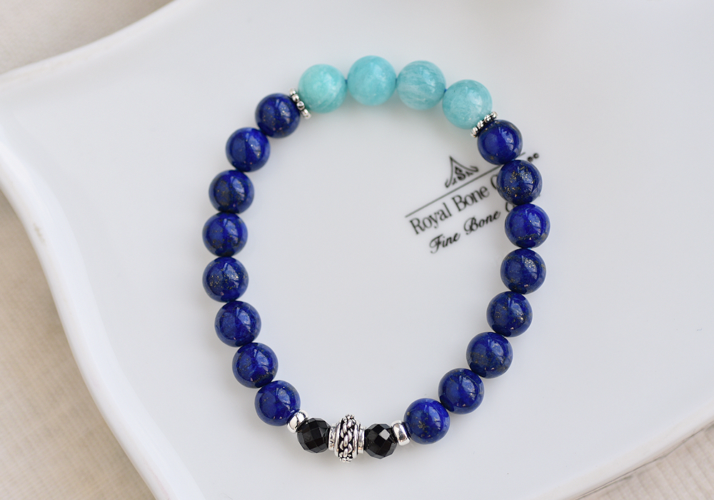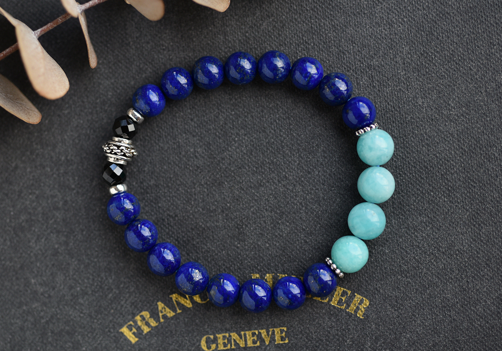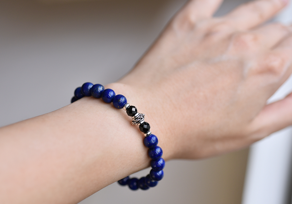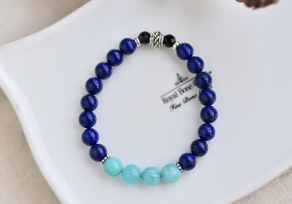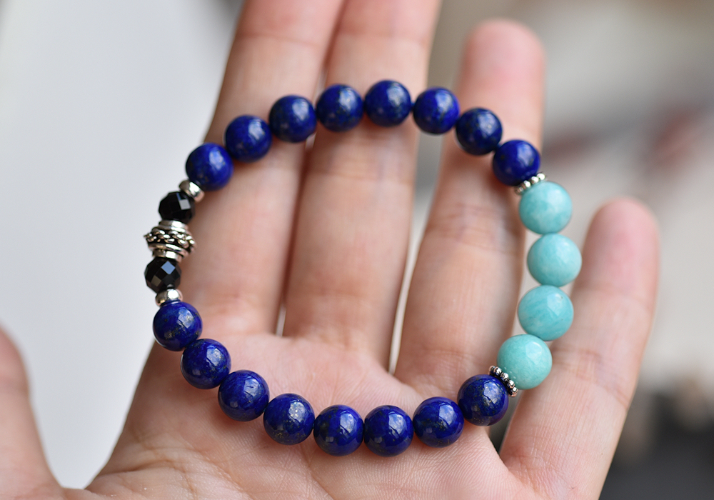 這款手鍊的青金石色澤很美,藍的濃豔飽滿,帶有少許的白斑跟金點
