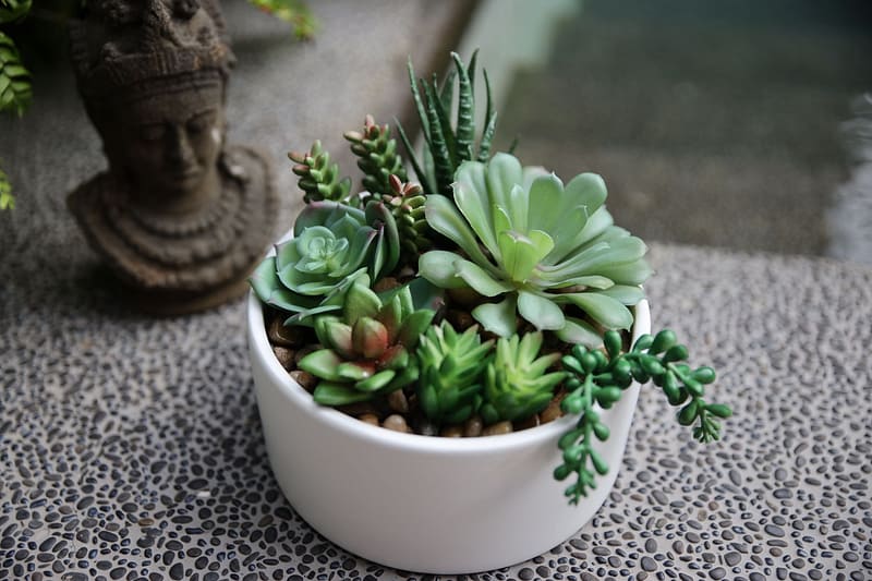 盛開的多肉植物,讓房內瞬間綠意盎然,加上多色的咖啡色石頭和白色的陶瓷盆栽來襯托出7種多肉植物各有的綠色層次感,任你擺放的位置增加天然和清新的風味。