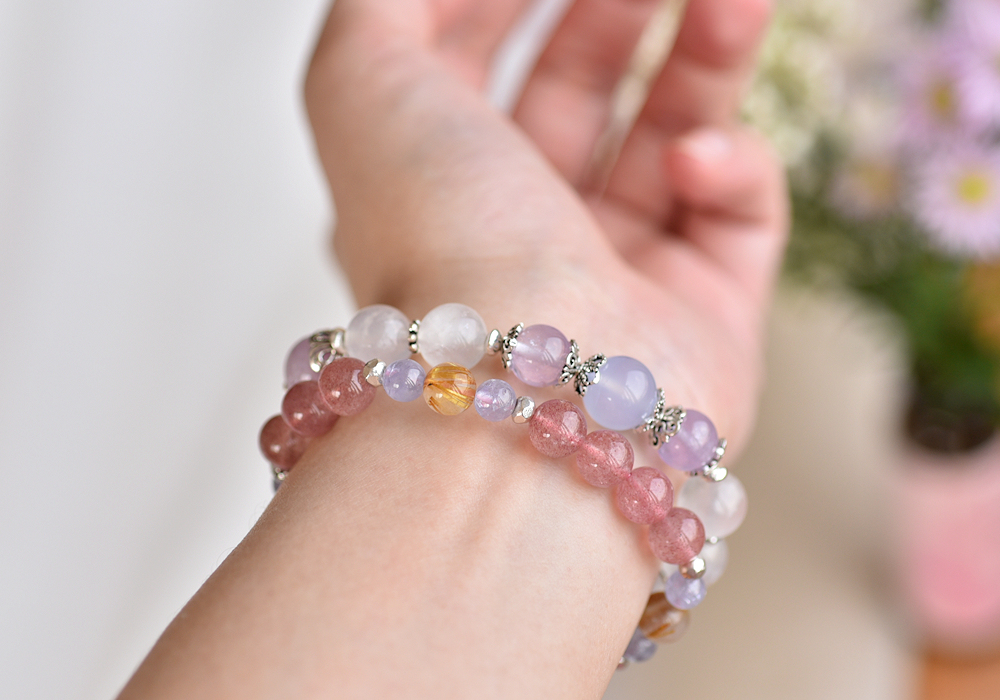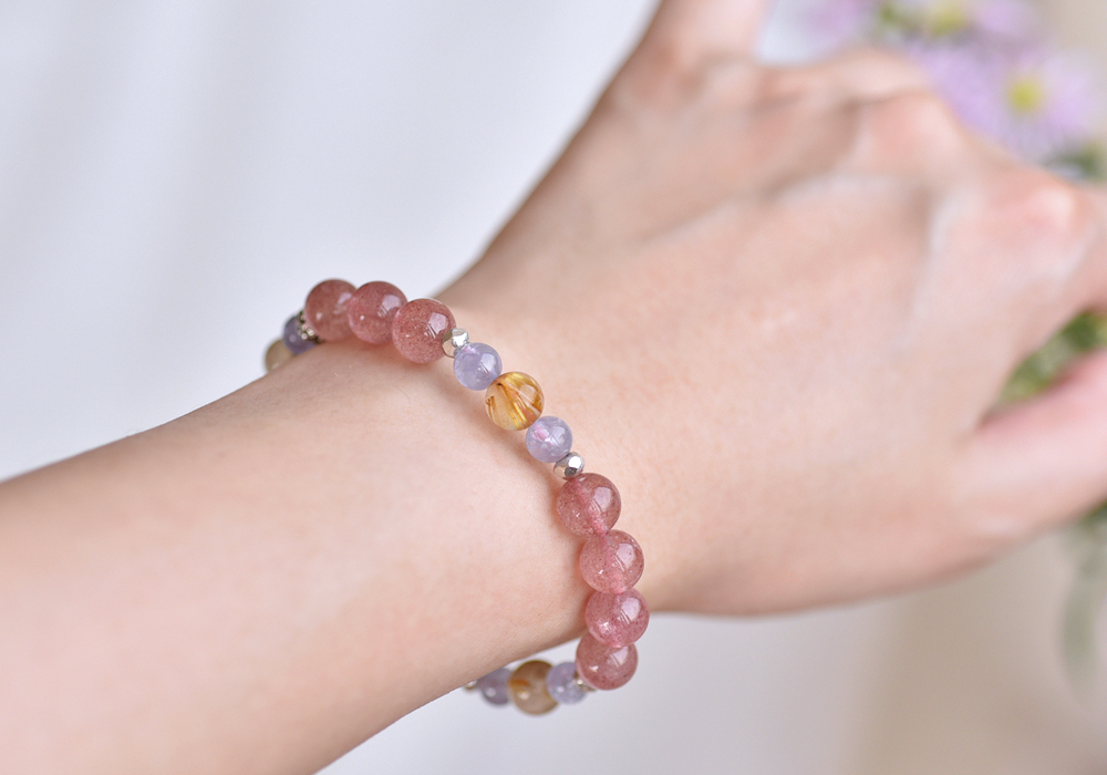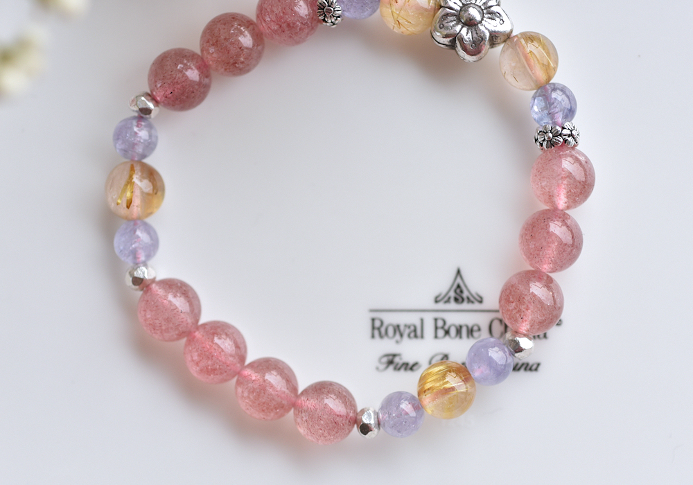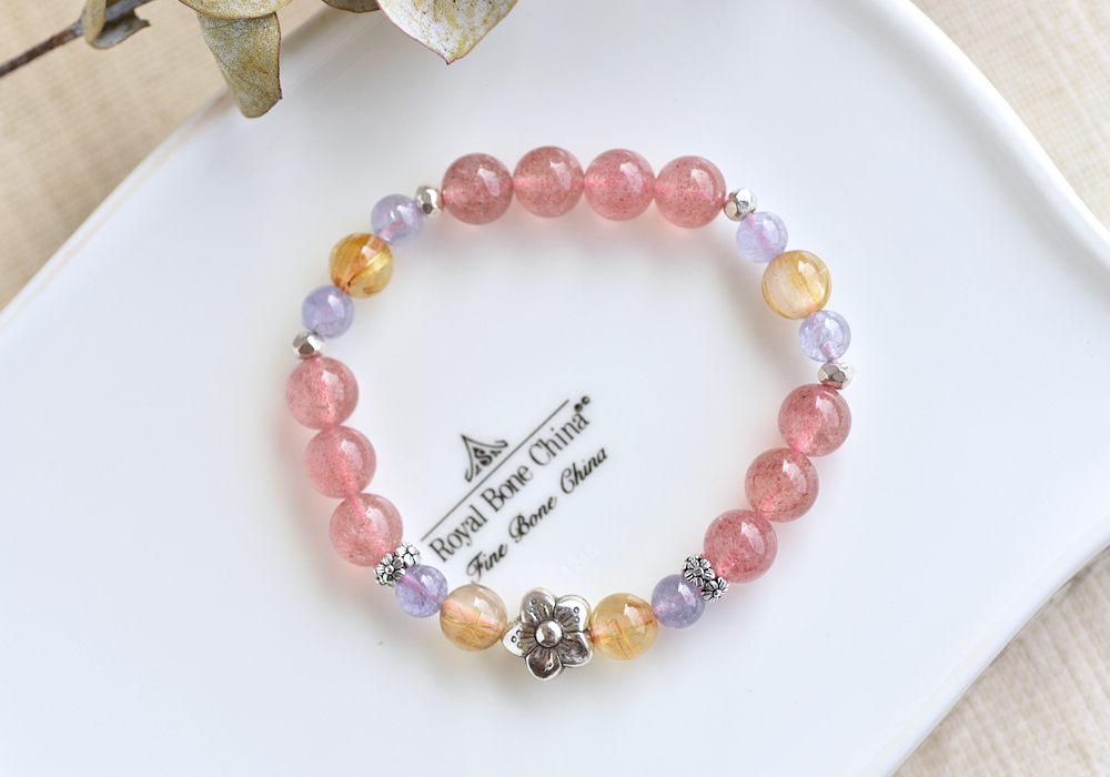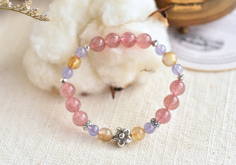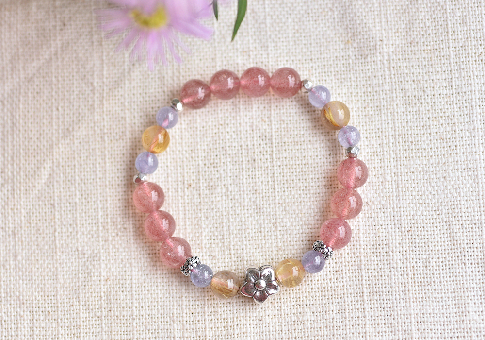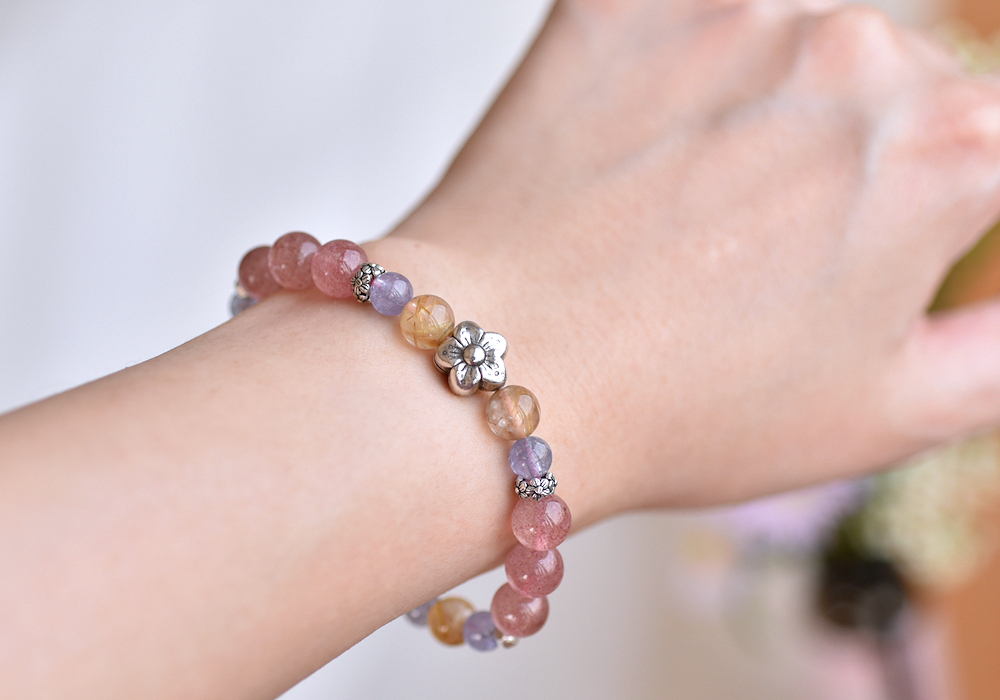**草莓晶+丹泉石+鈦晶+花朵純銀水晶手鍊**