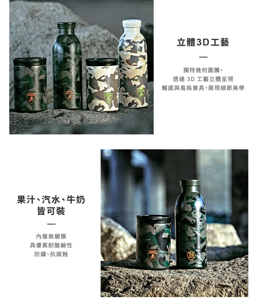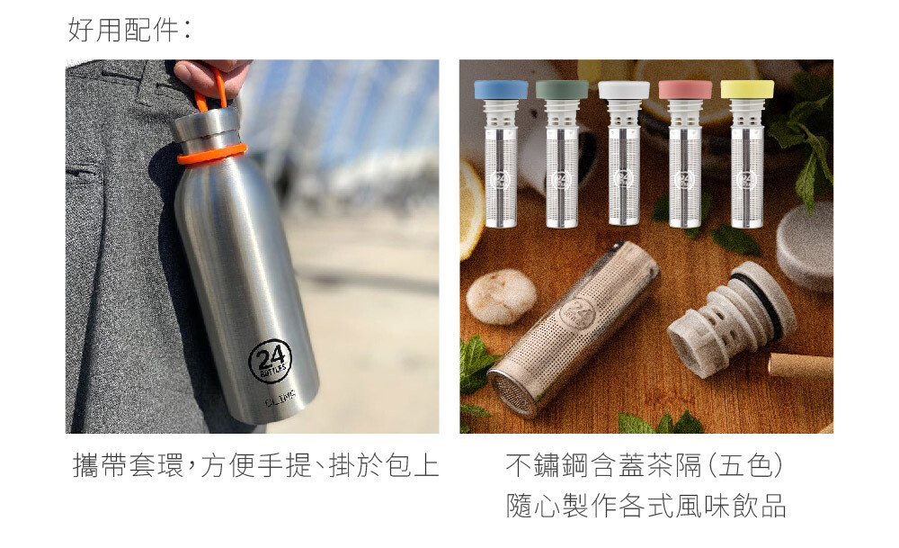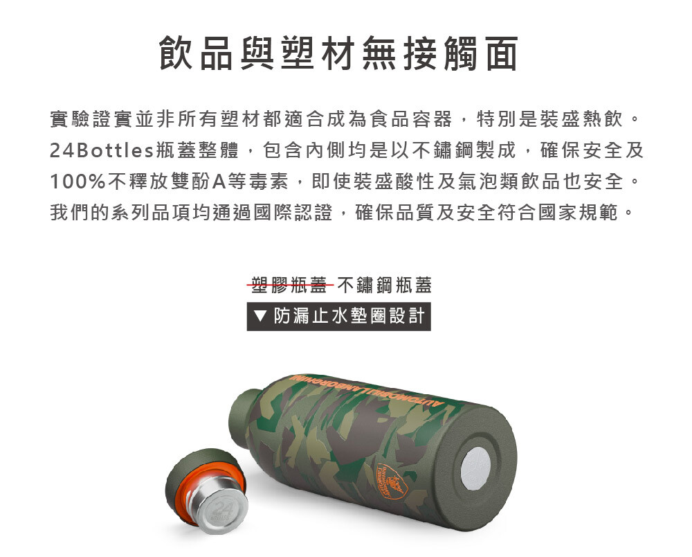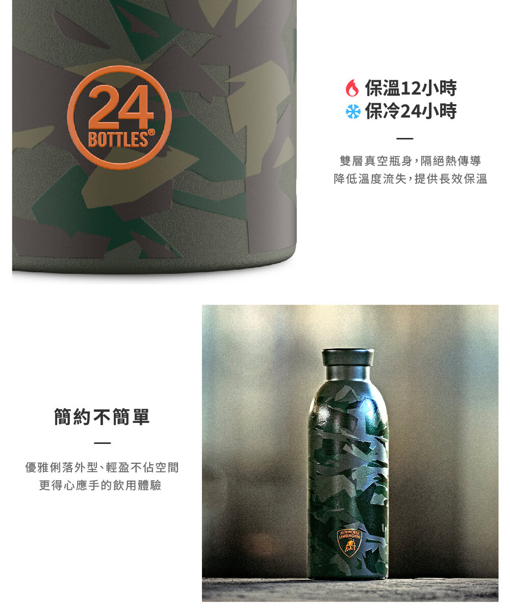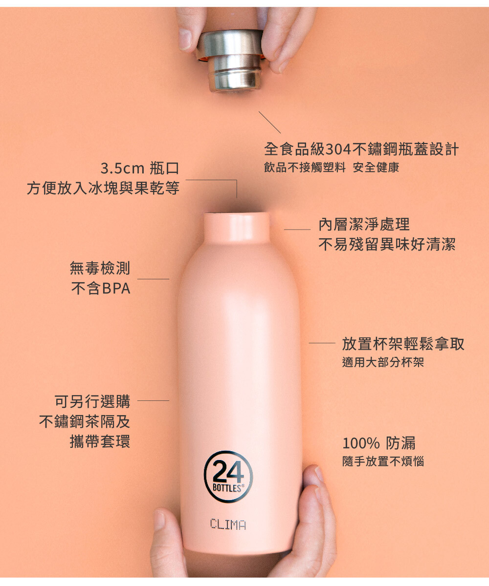24Bottles 保溫瓶採用雙層真空斷熱層,有效隔絕熱傳導,保溫12小時、保冷24小時。