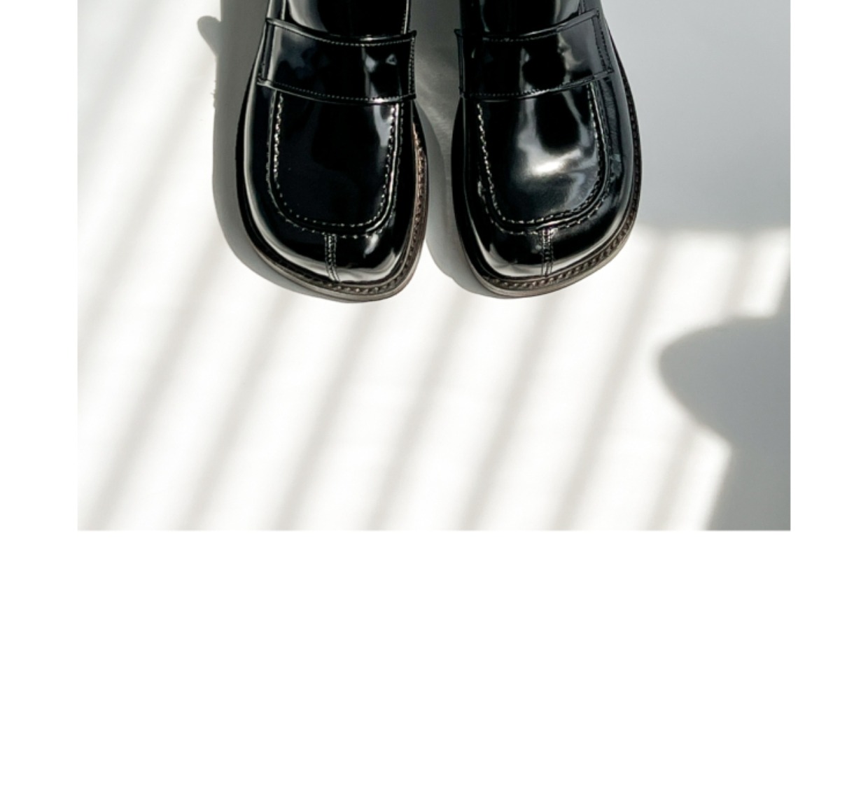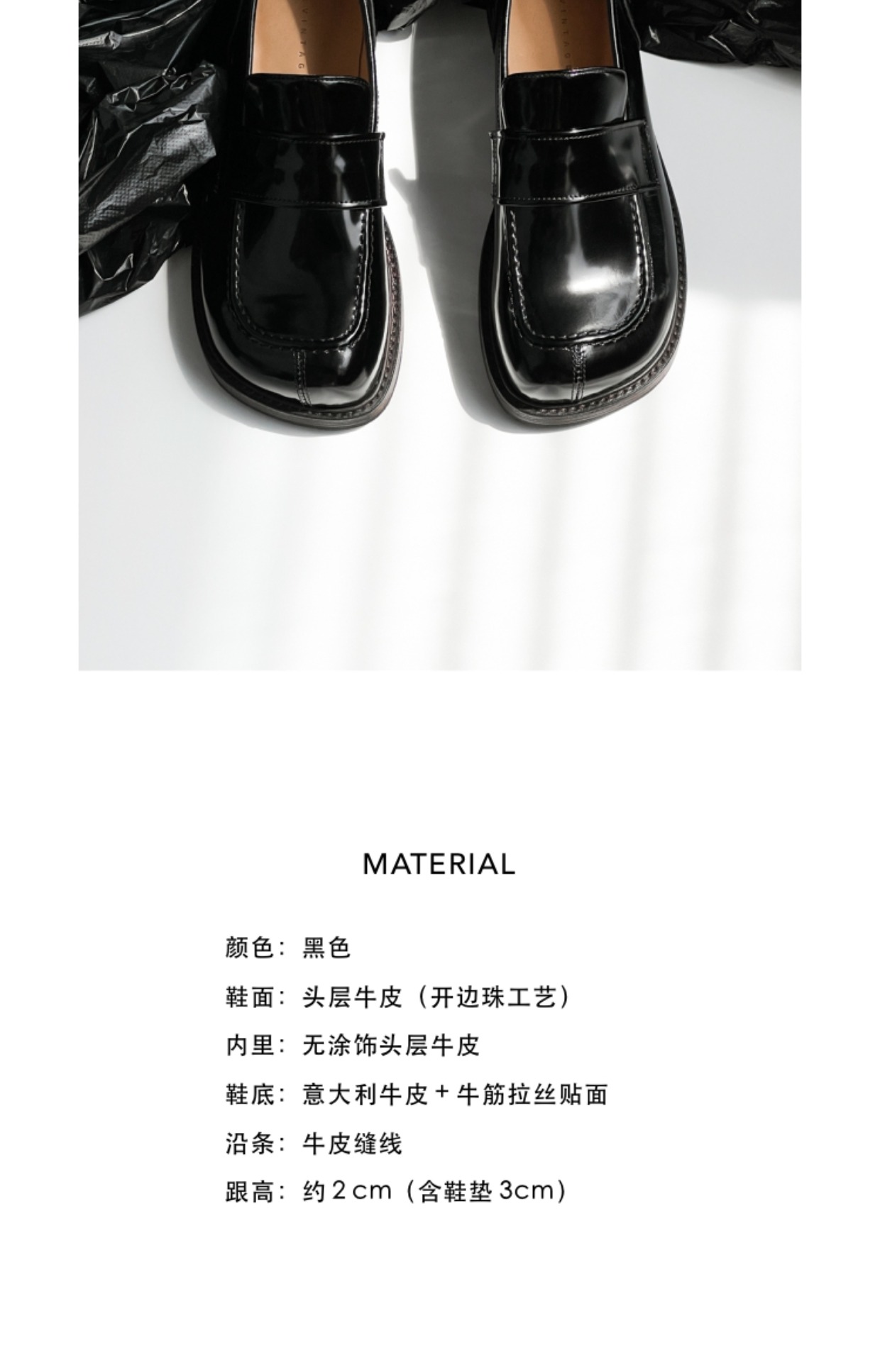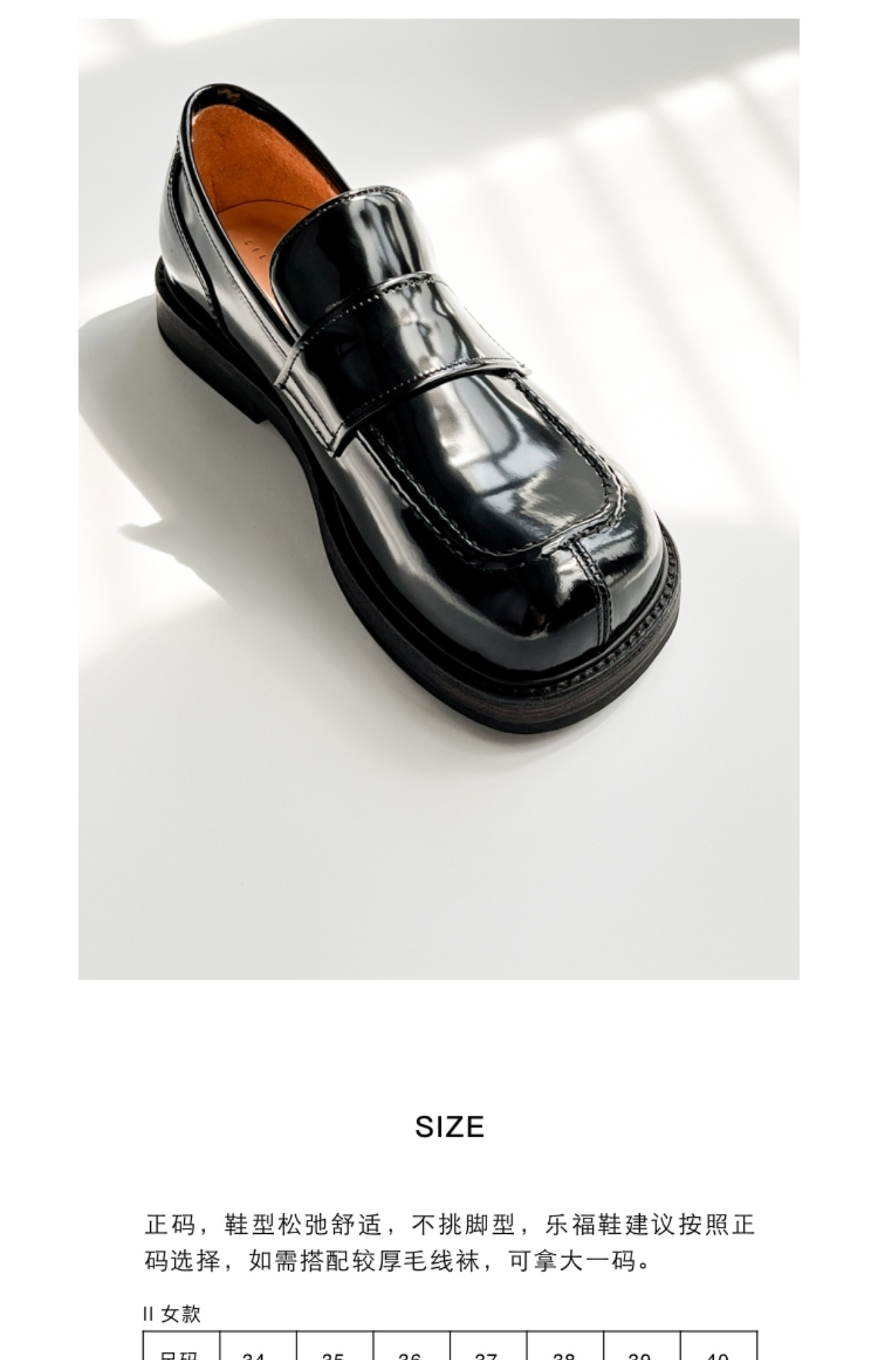 鞋頭造型飽滿,鞋身立體挺拔,內部空間鬆弛,適合各種腳型。鞋面造型工藝復雜,不規則狀的大圓頭設計,區別於市面上眾多樂福鞋
