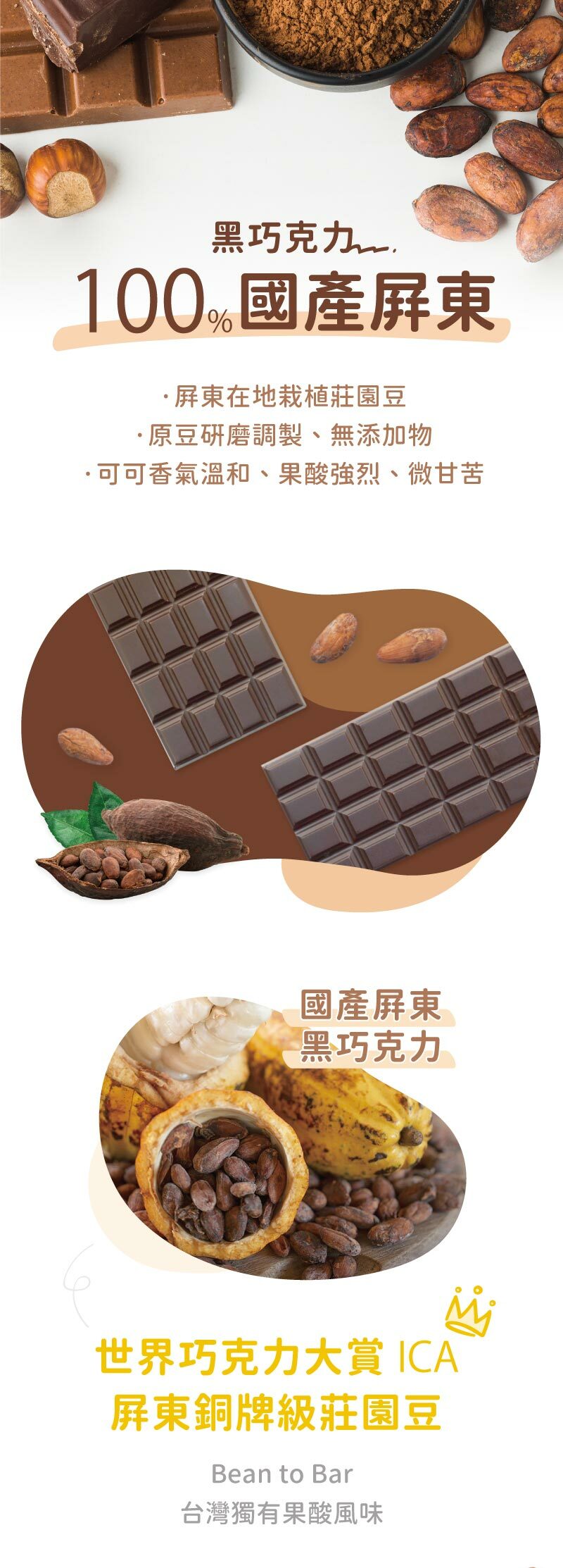 嚴選台灣屏東、非洲迦納可可製成黑巧克力!Bean to Bar 完整保留可可營養素,無添加物、香精、代可可脂,呈現可可最真實的天然風味!