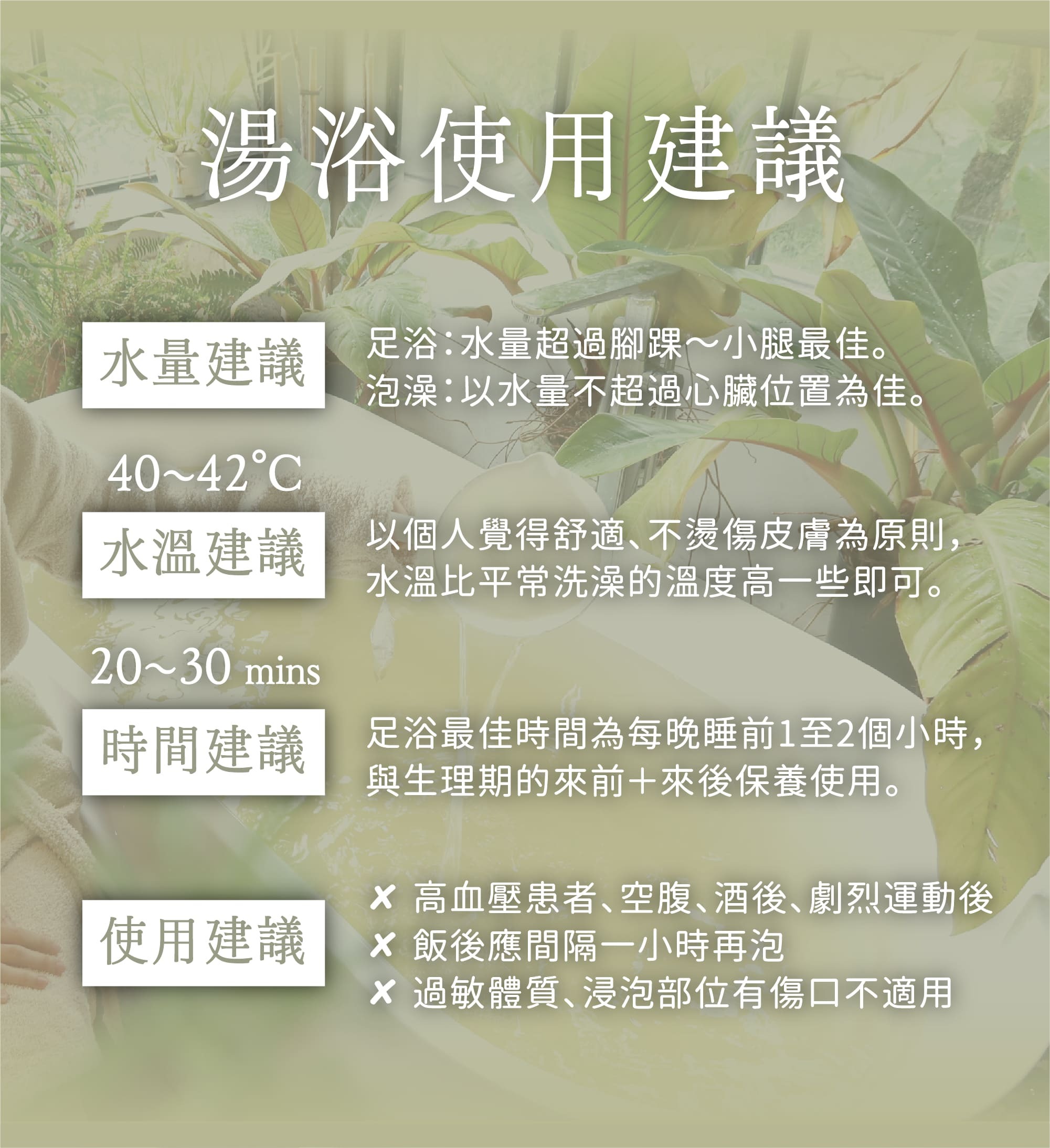 × 浸泡部位的肌膚本身有傷口或不適症況,使用前建議先詢問醫師的意見