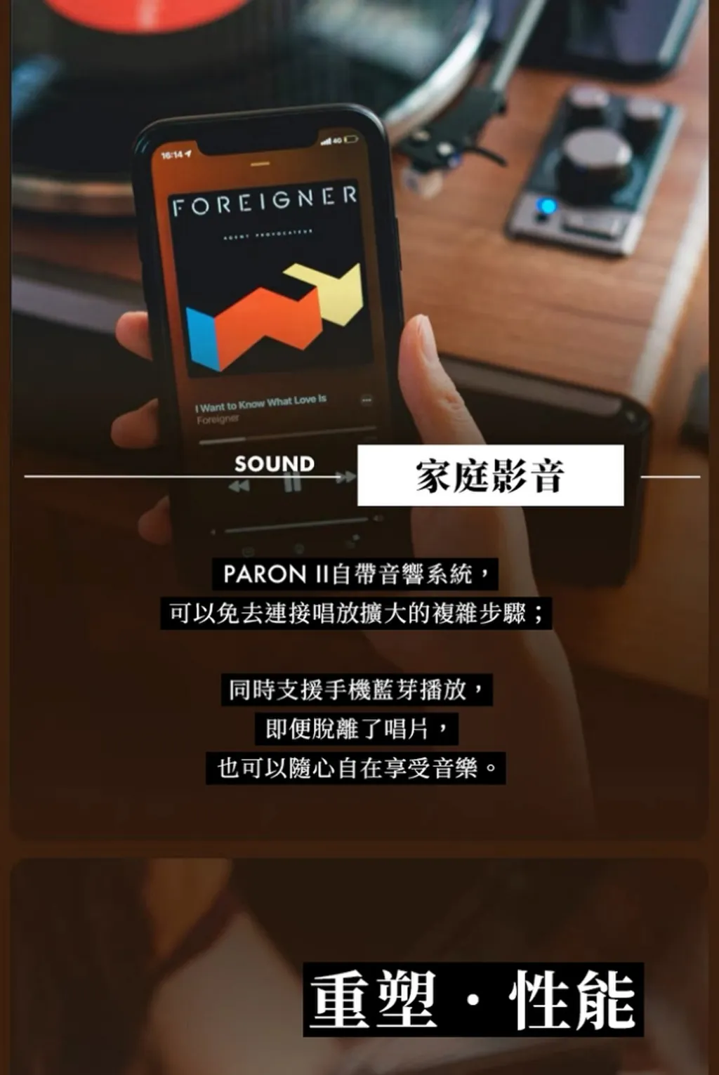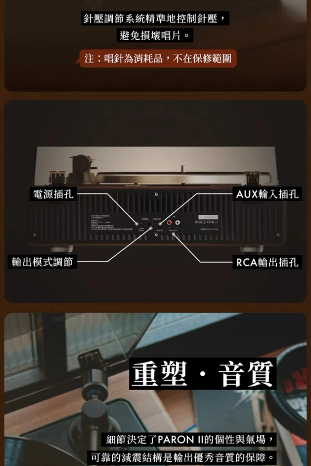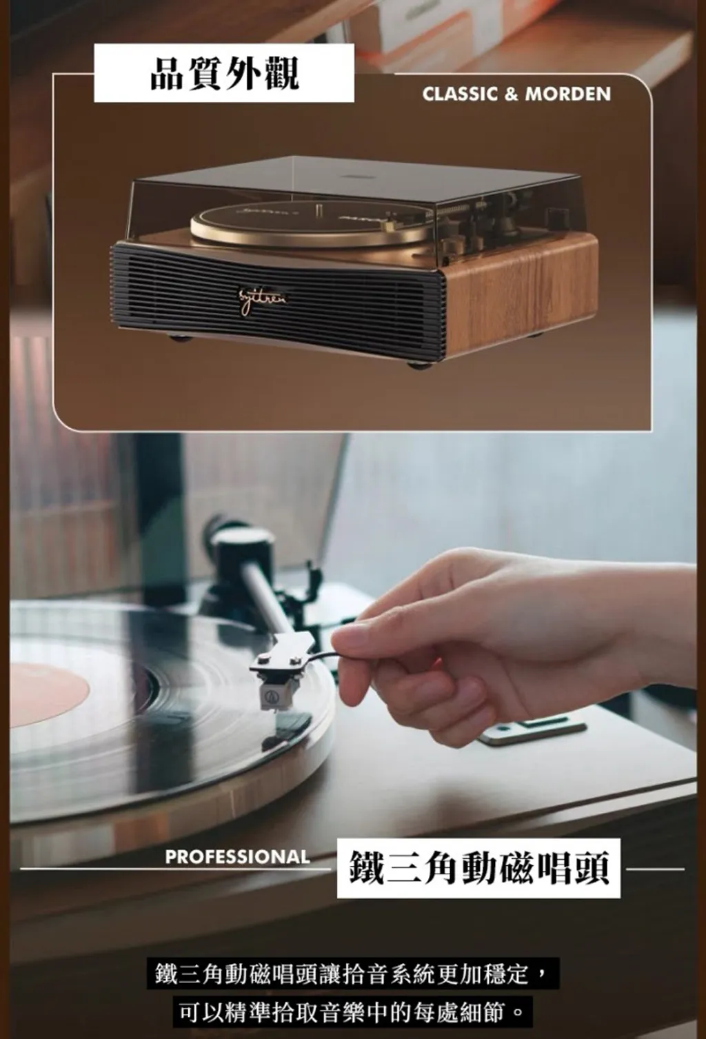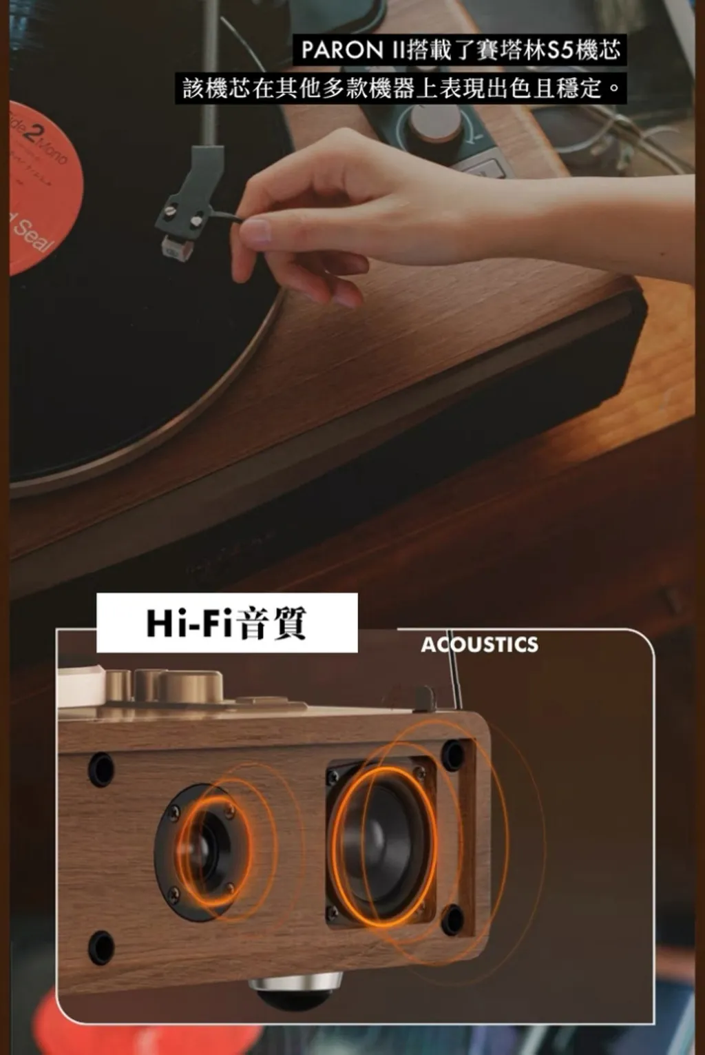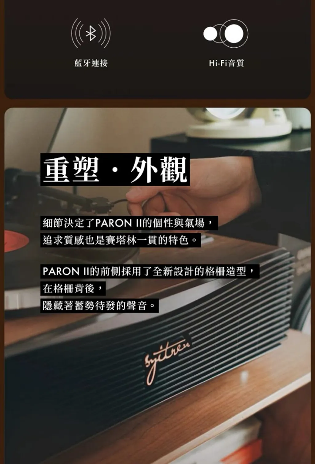 賽塔林sytrien PARON 2 黑膠唱片機 不僅注重音質,還融合了當代的設計感,提供了多種連接方式,讓您隨時隨地享受高品質的音樂體驗。兼具黑膠播放和藍芽音響的功能,為您帶來高品質的音樂體驗。