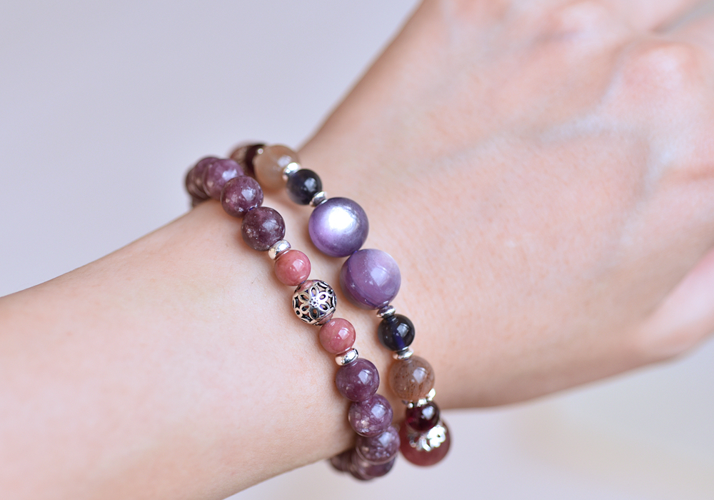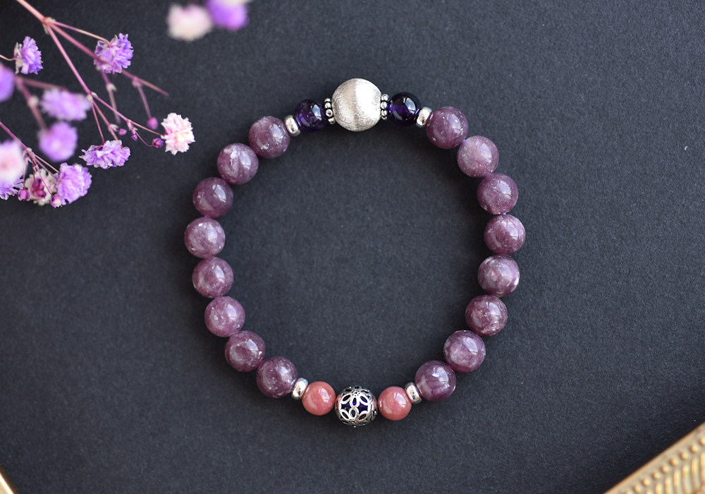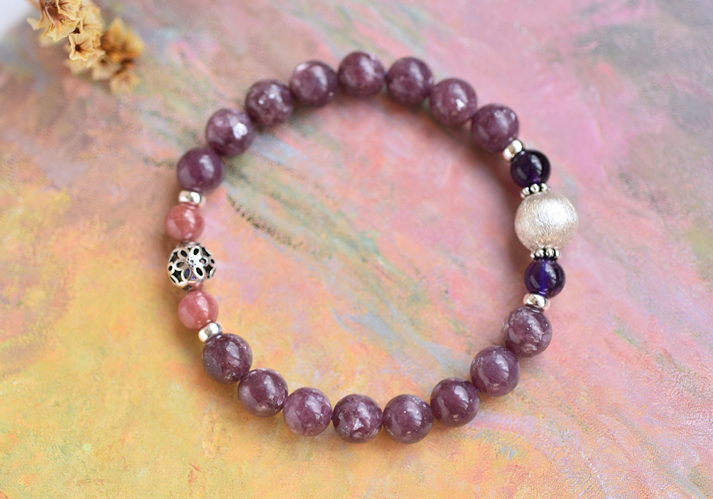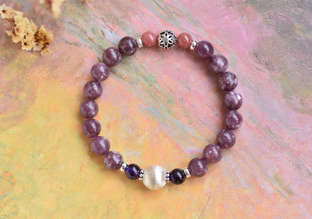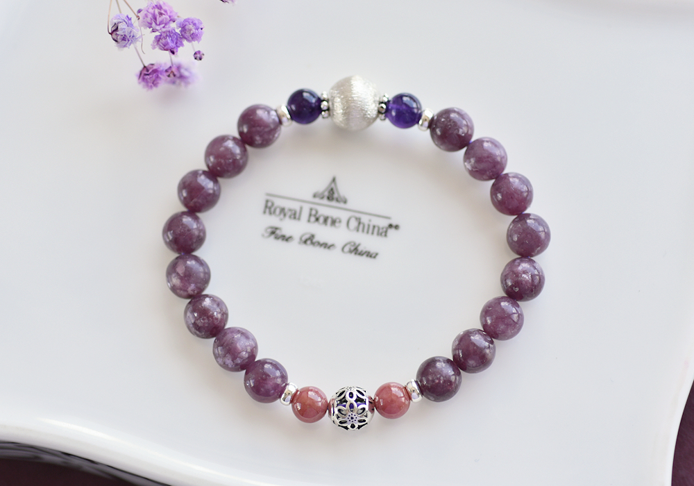 **閃耀鋰雲母+玫瑰石+紫水晶純銀水晶手鍊**