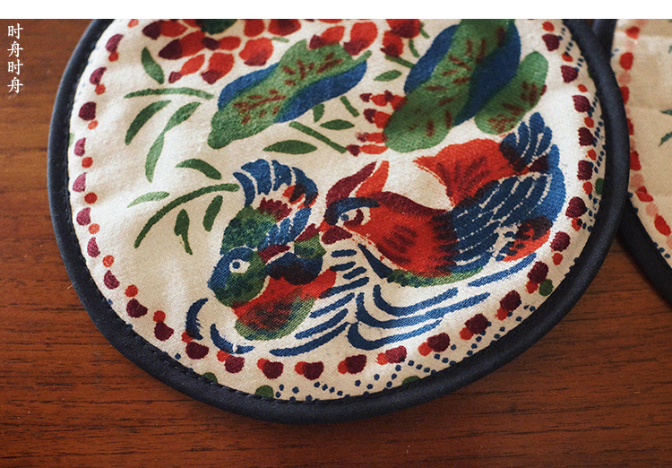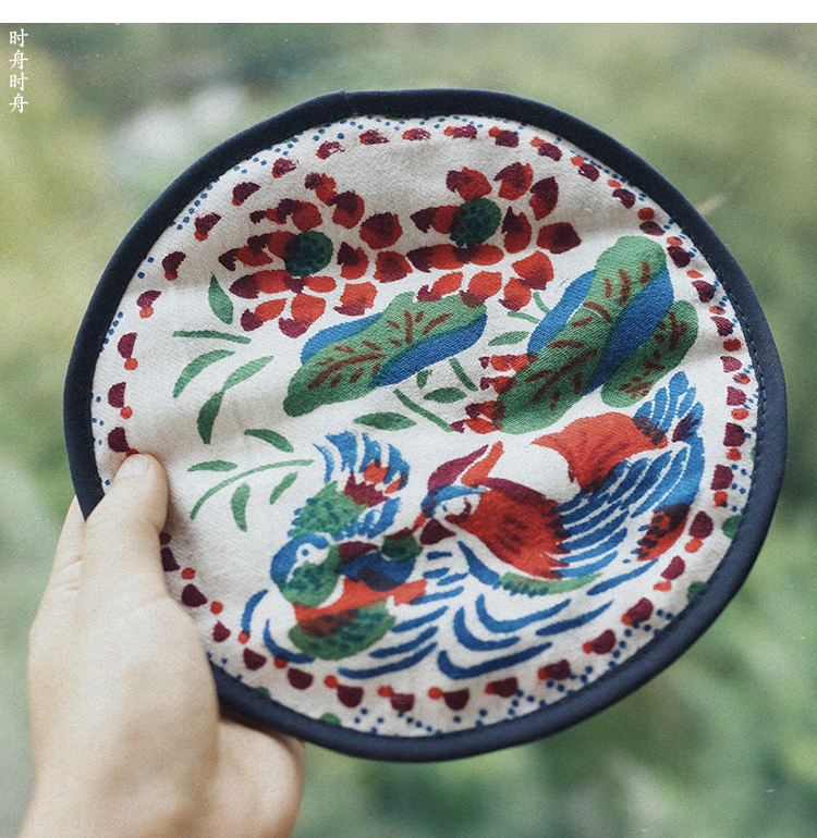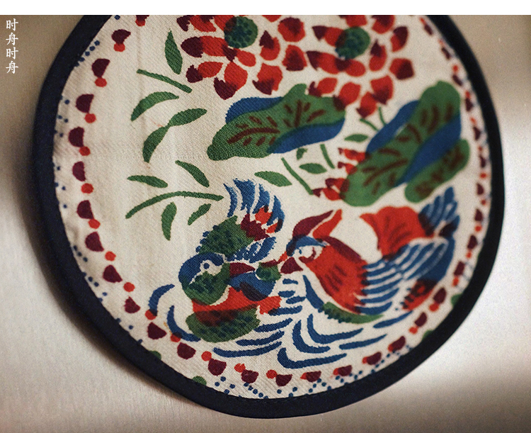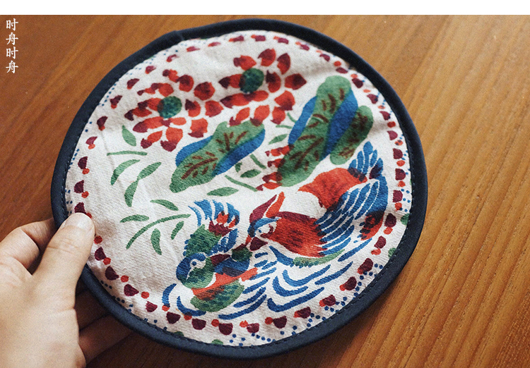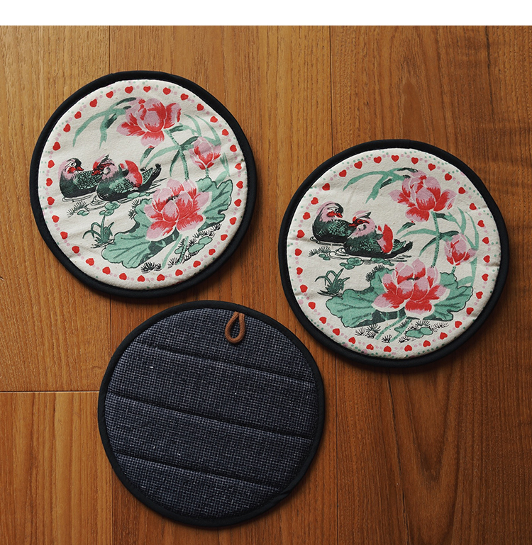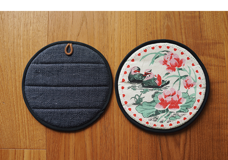 鴛鴦荷花 藍圓點手工織布 雙面用 夾棉防燙餐墊 隔熱布墊