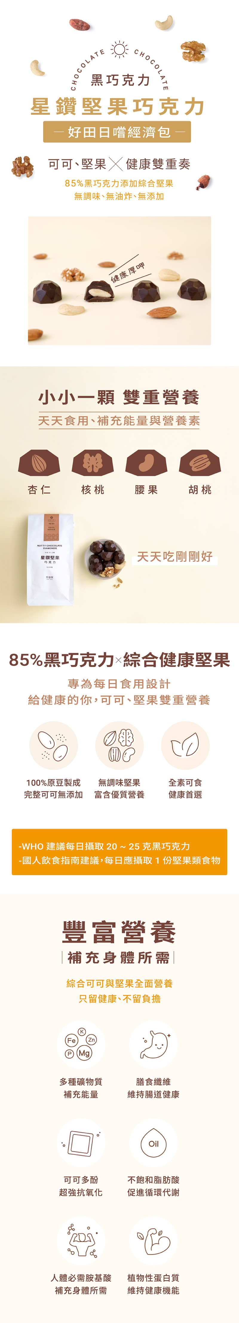 - 85%苦甜黑巧克力,搭配涮嘴堅果,口感多層次!