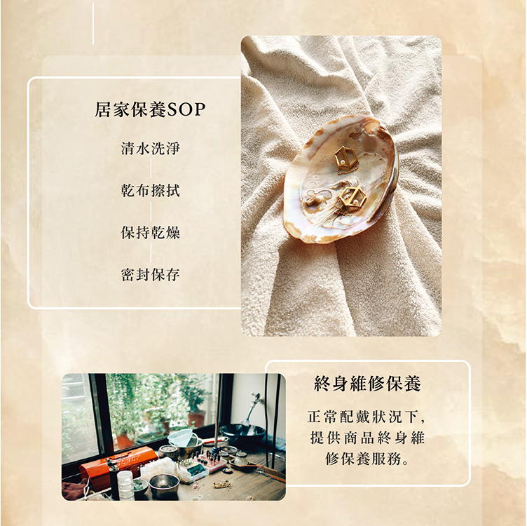 使用及保養方式|和所有金屬一樣,接觸化學藥品有機會加速氧化,使得表面失去原本的光亮。請盡量避免接觸清潔劑等溶液,如需清潔請以清水沾濕棉布擦拭即可。在正常配戴情況下,我們提供商品終身的維修保養服務。