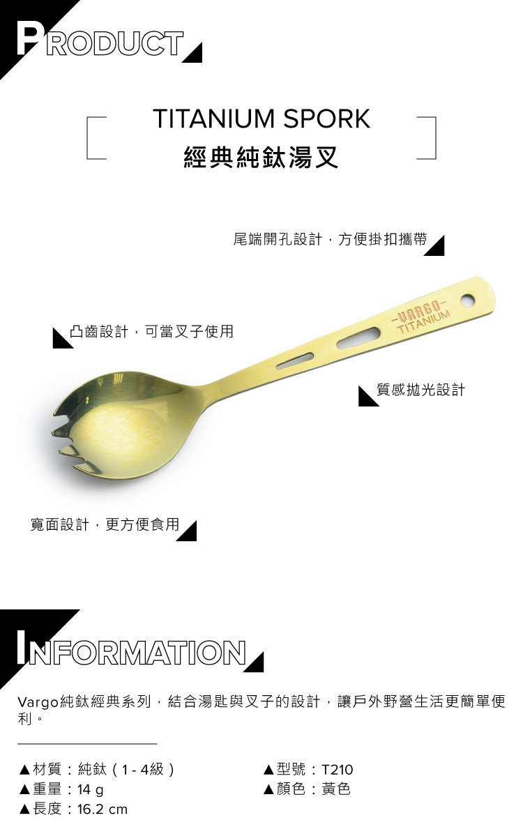 【美國 Vargo】 Titanium Spork 經典純鈦湯叉 黃色 #T210