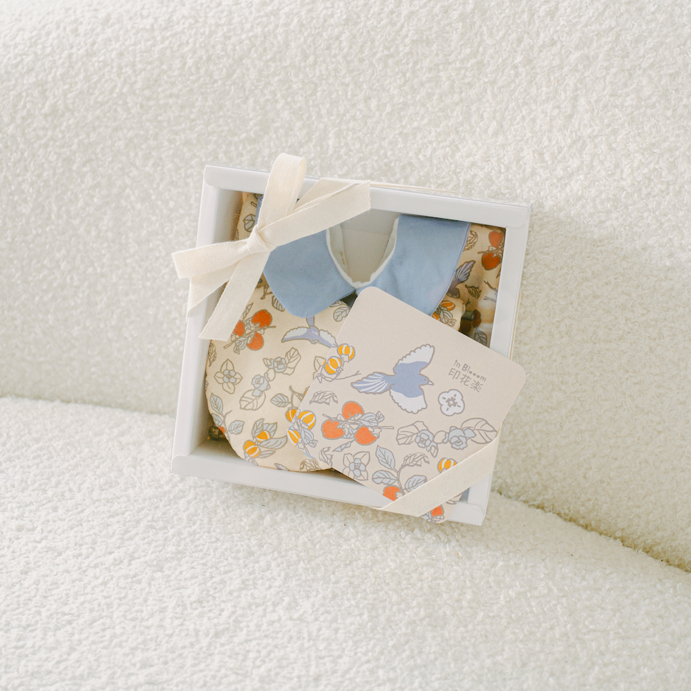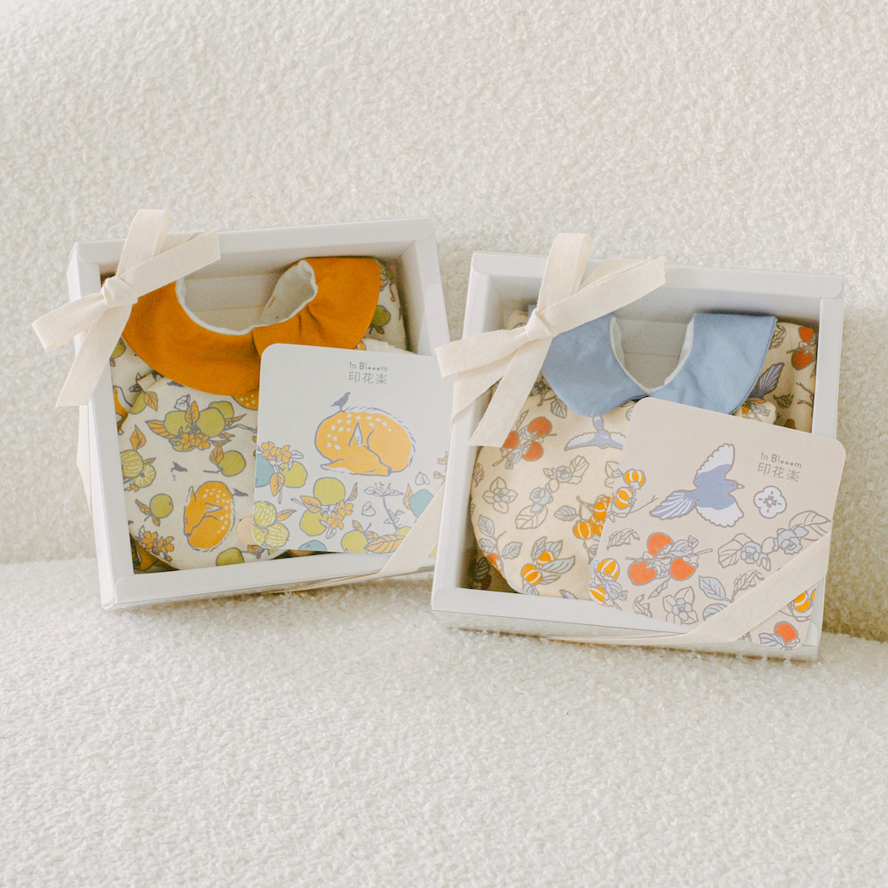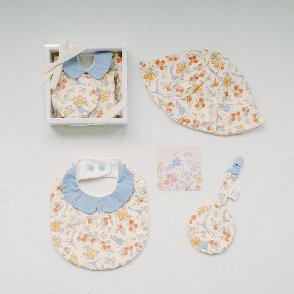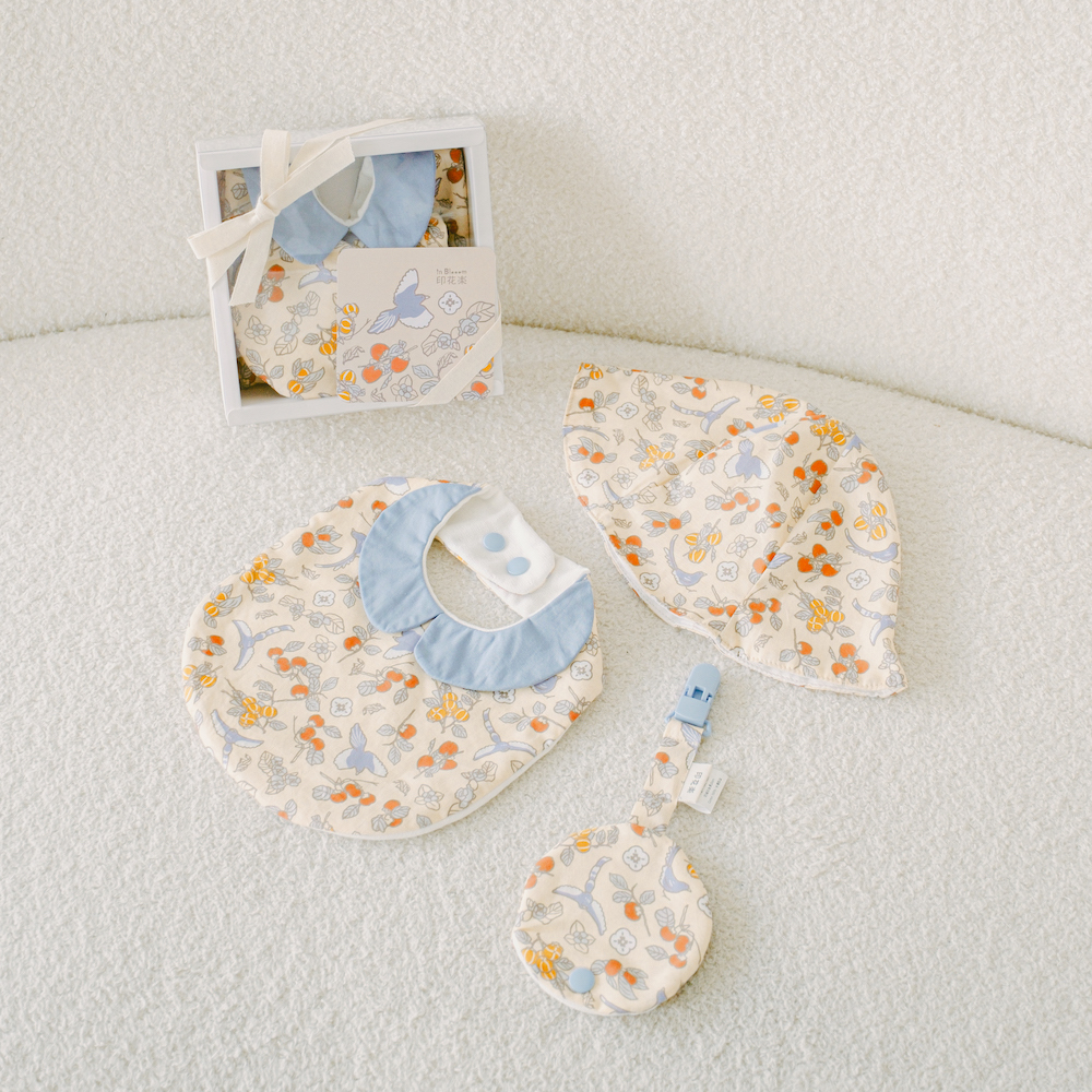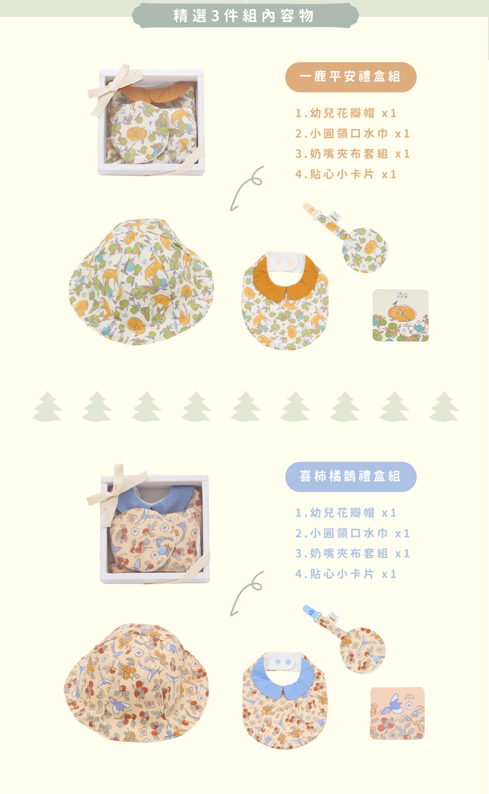 印花樂寶寶彌月禮盒|精選3件組/嬉遊山林/喜柿橘鵲- 幼兒花瓣帽+花瓣口水巾+奶嘴夾布套組