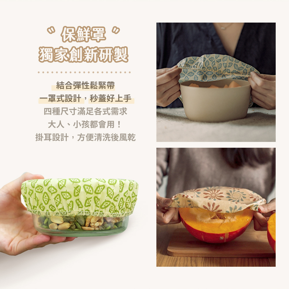首創罩型蜂蠟保鮮布,一罩式設計,秒蓋保鮮。