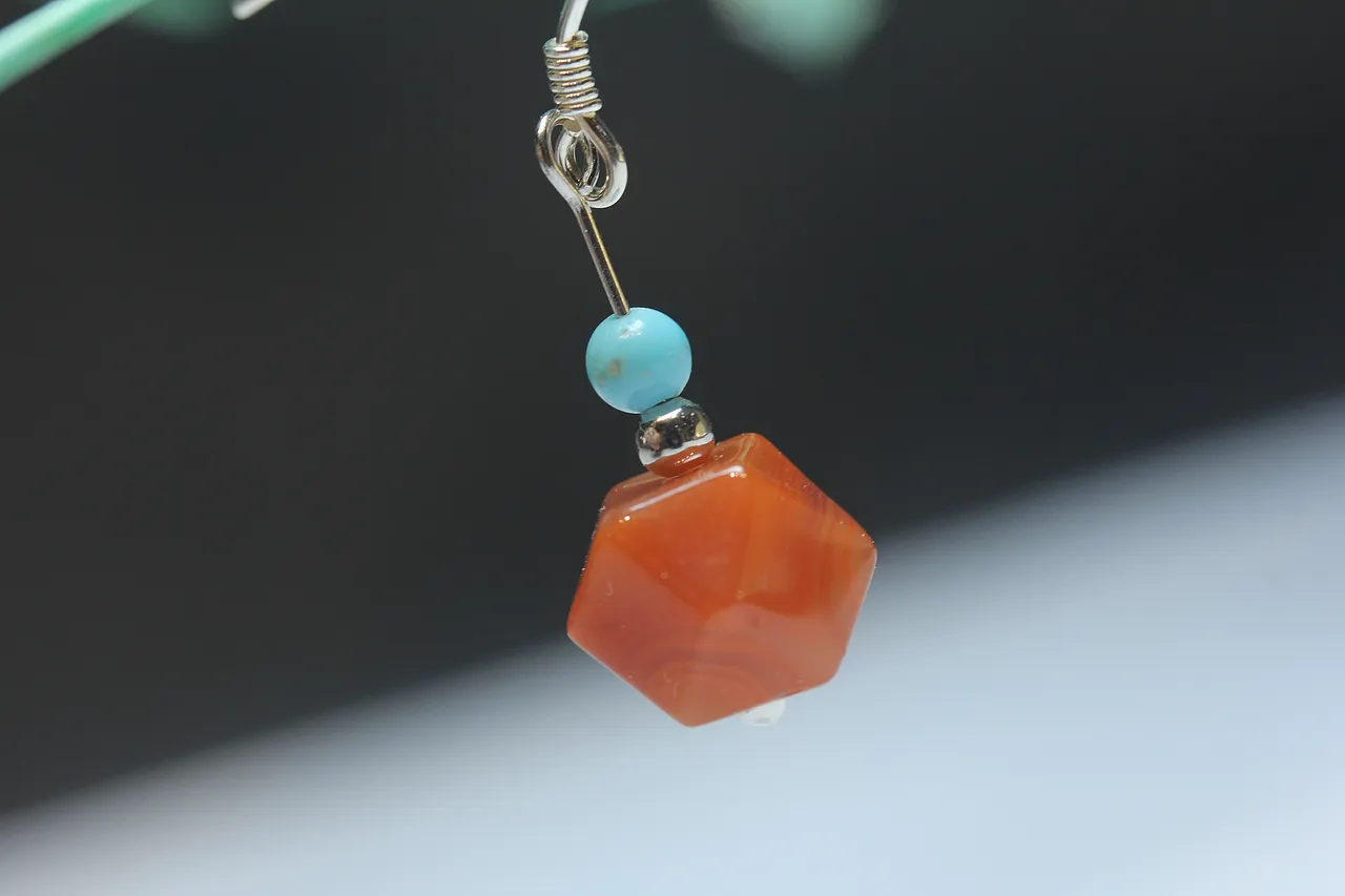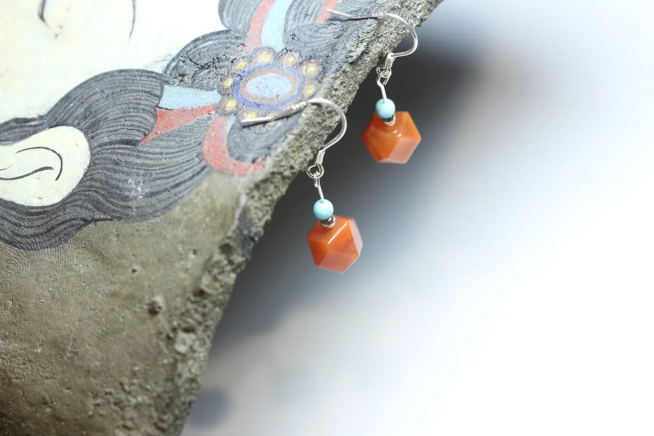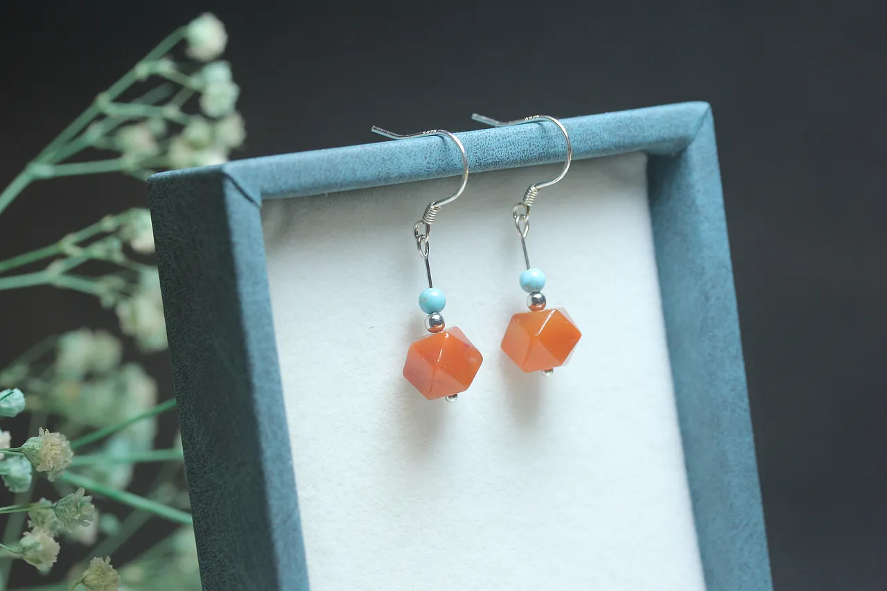 【描述】: 由多棱面南紅瑪瑙設計的耳墜,細節用天然綠松石點綴,紅配綠,簡約大方,長度適中,彰顯品位格調。