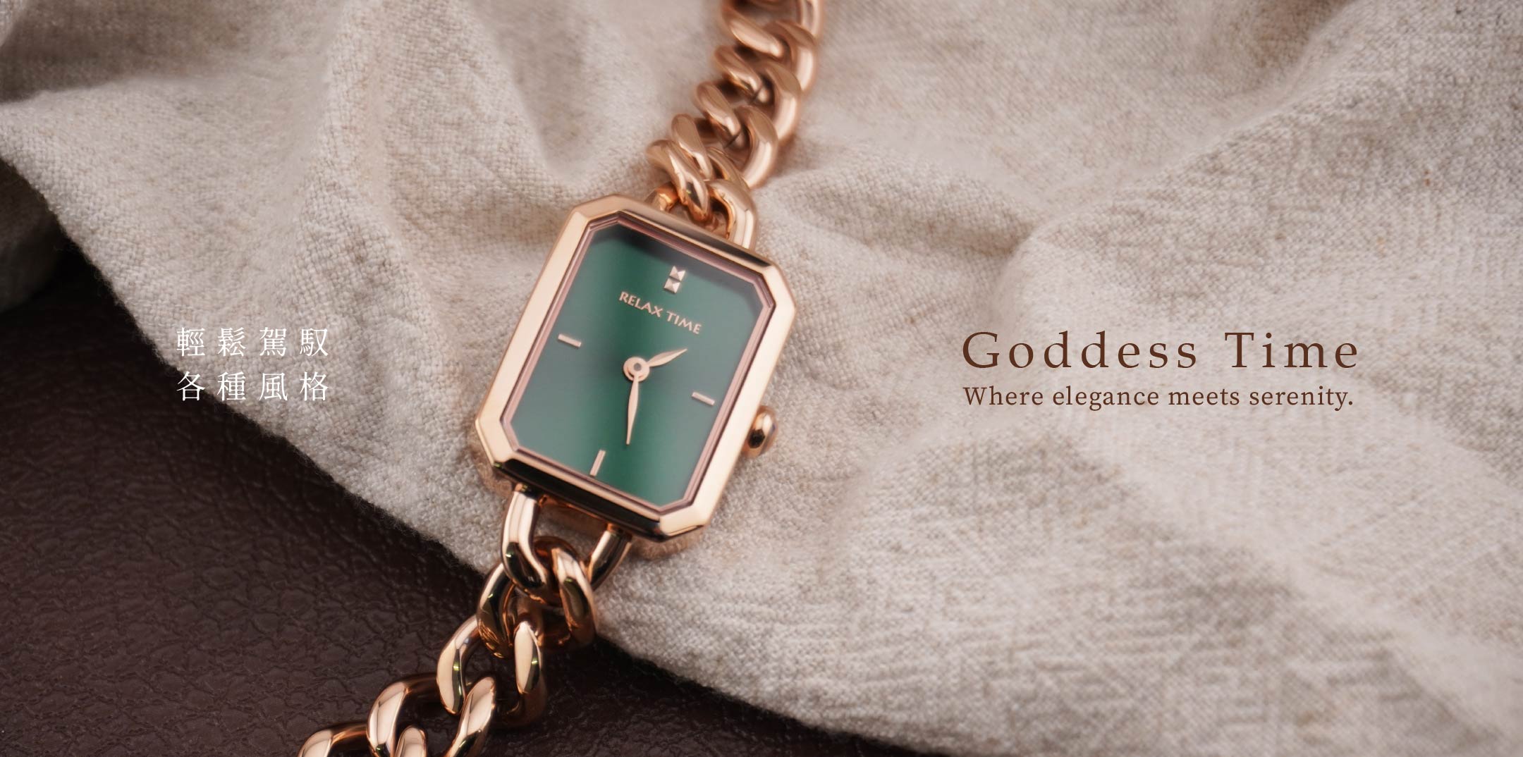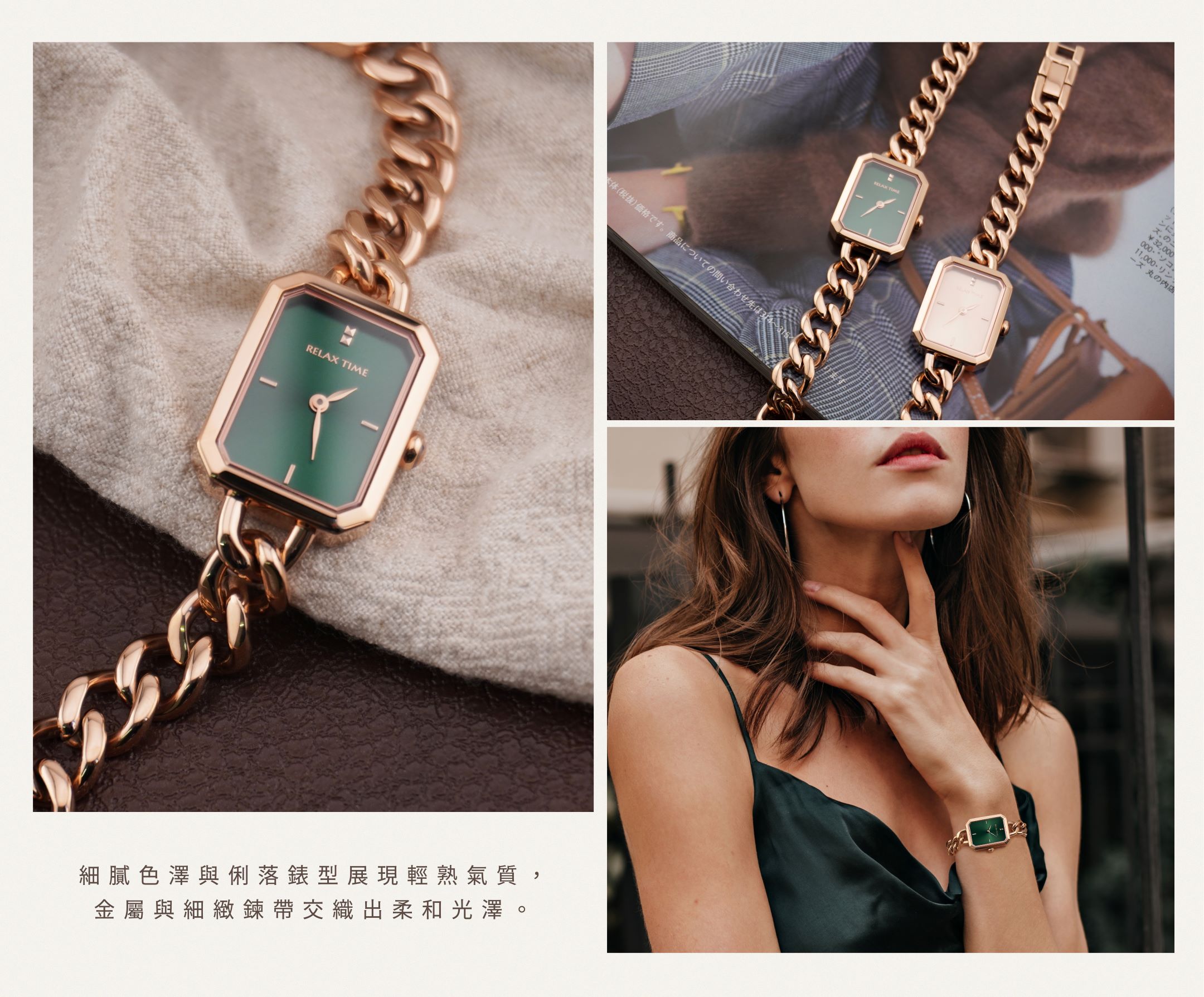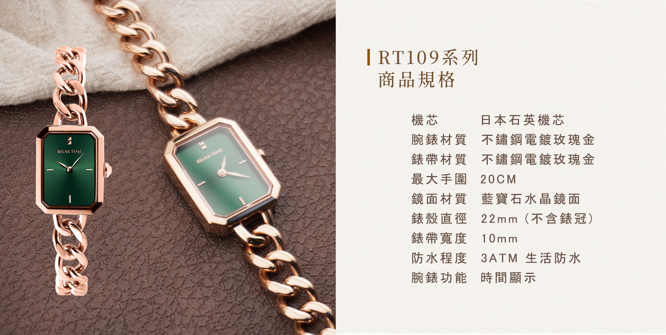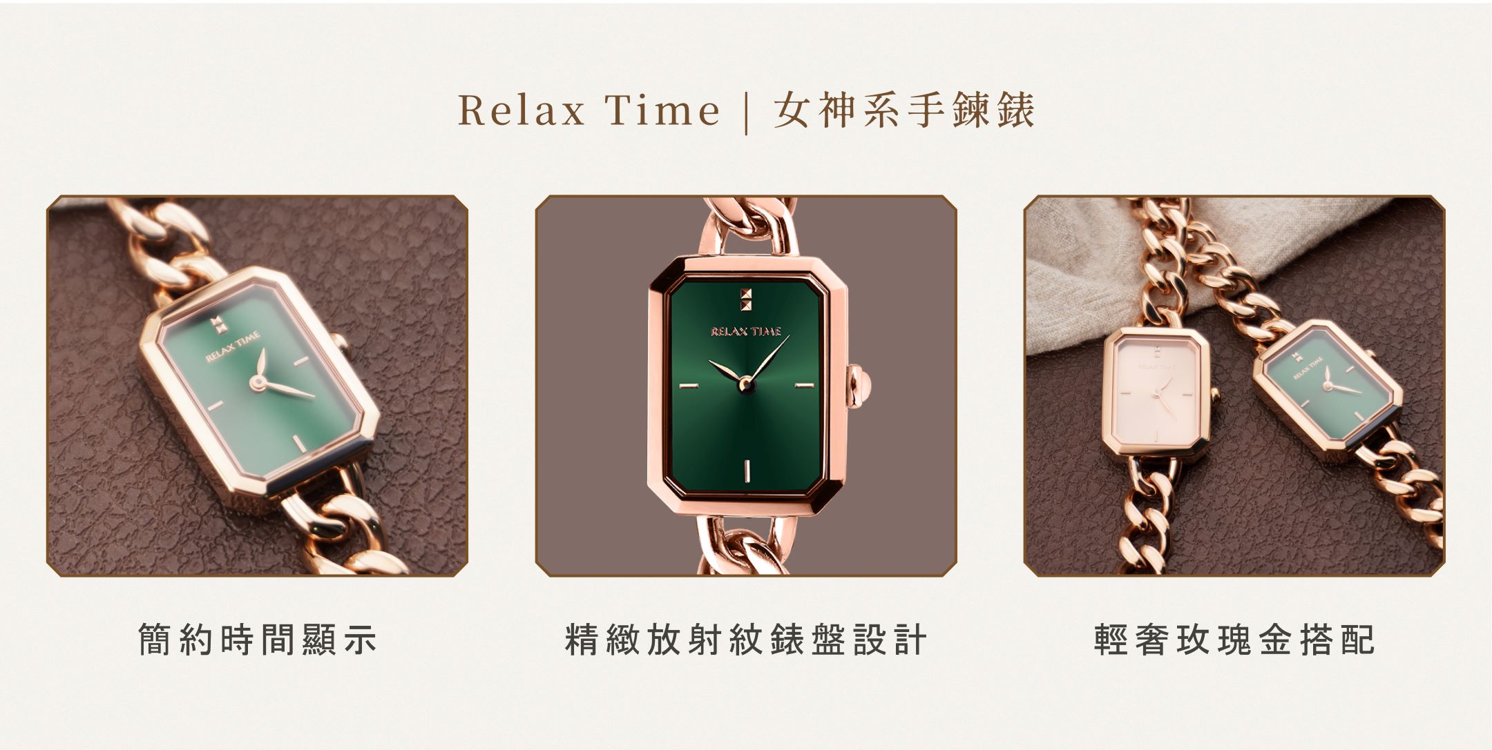 RELAX TIME 長方手鍊風格女錶 玫瑰金 綠 (RT-109-2-06)