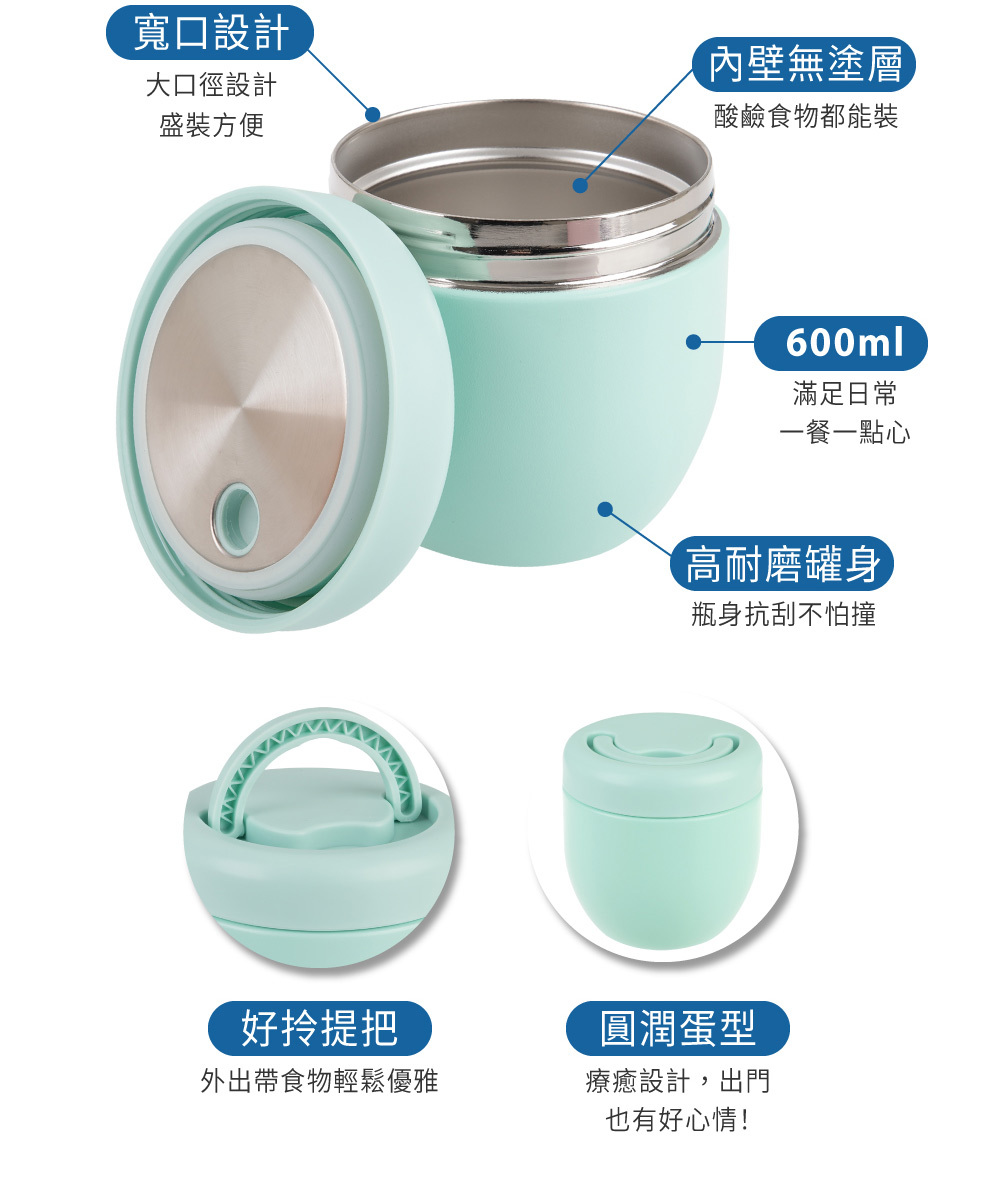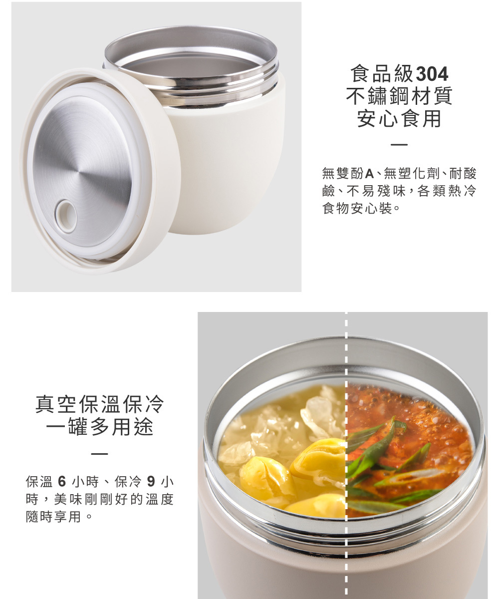 可愛蛋型外觀收服視線,卻藏著實力派的保溫實力!內外採用食品級 304 不鏽鋼,搭配雙層真空結構,保溫約 6 小時、保冷約 9 小時,無論是熱粥、湯品或冰水果,隨時都能品嚐剛剛好的溫度。