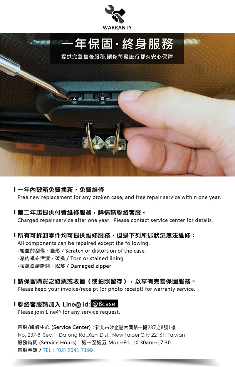* 此款行李箱使用TSA海關密碼鎖,是沒有提供鑰匙的。