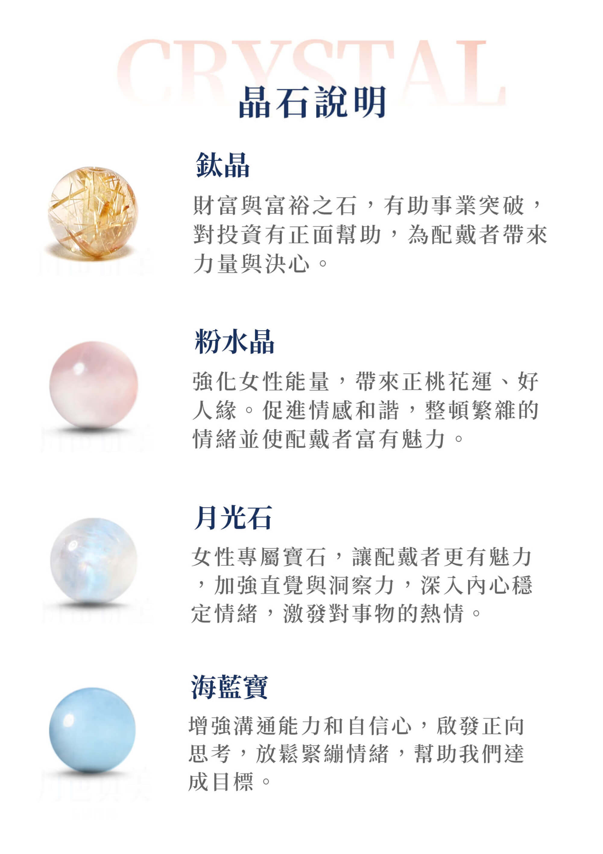 鈦晶、粉晶、月光石、海藍寶、葡萄石、白水晶