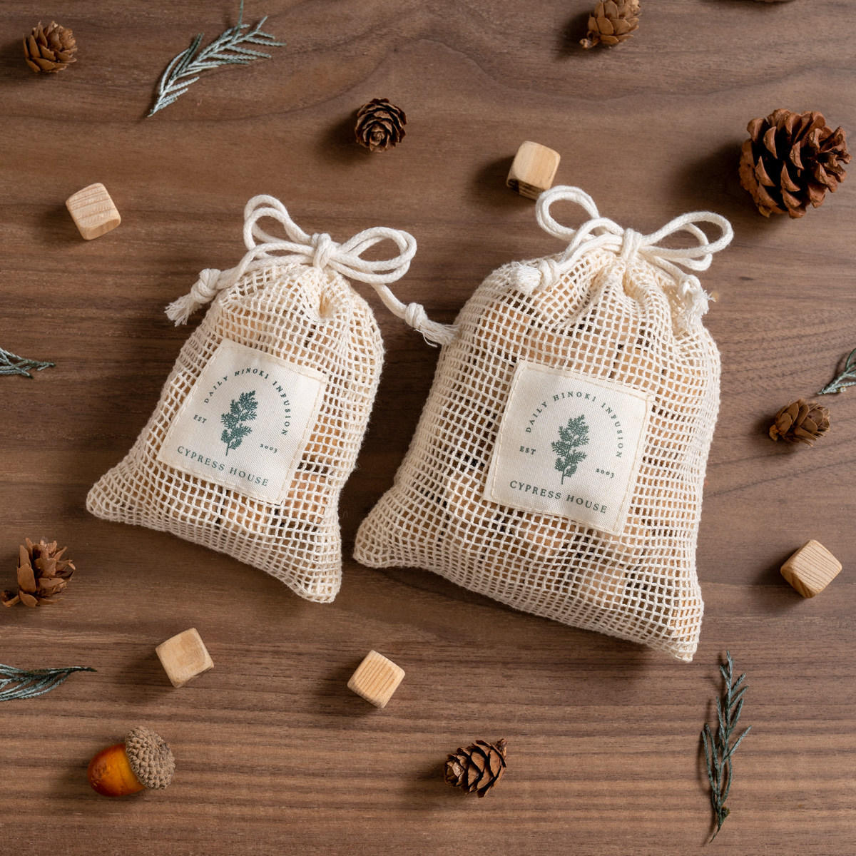 若希望維持木質香氣,可在方塊上滴入3-5滴台灣檜木精油後於網袋中搖勻。