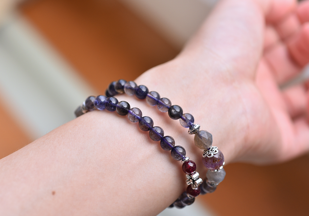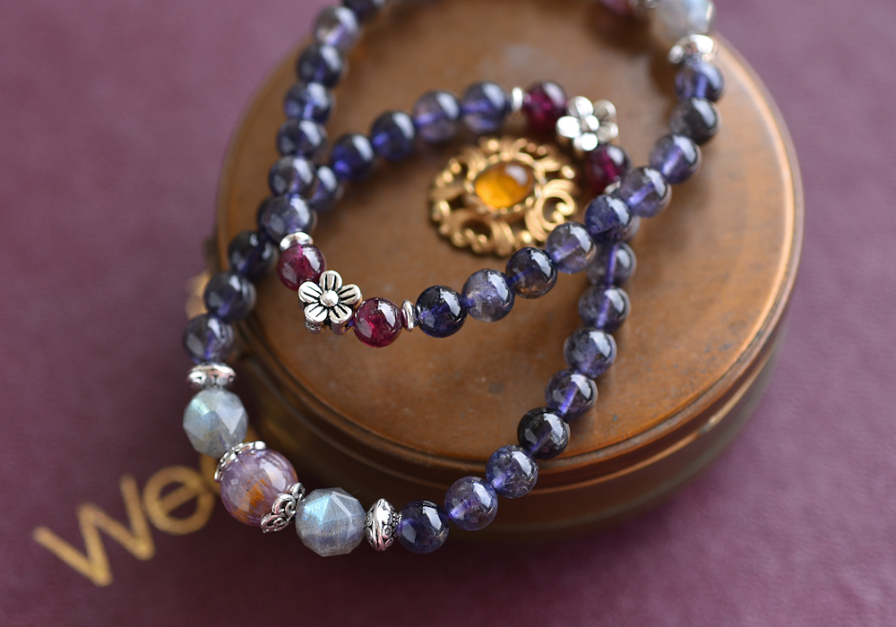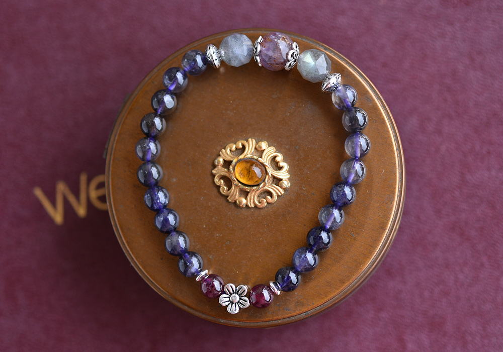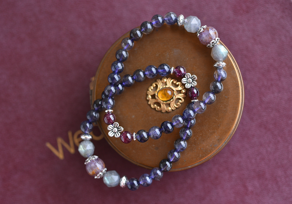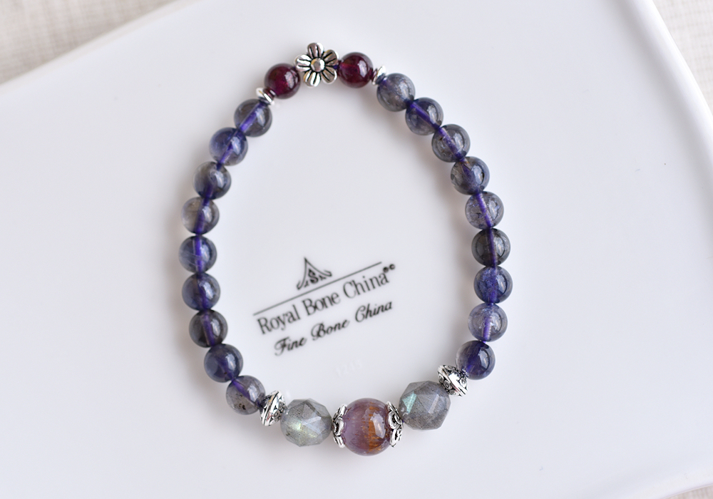 **堇青石+紫鈦晶+拉長石+石榴石純銀水晶手鍊**