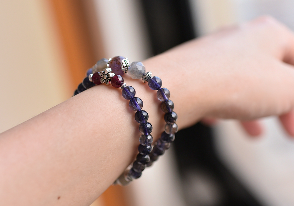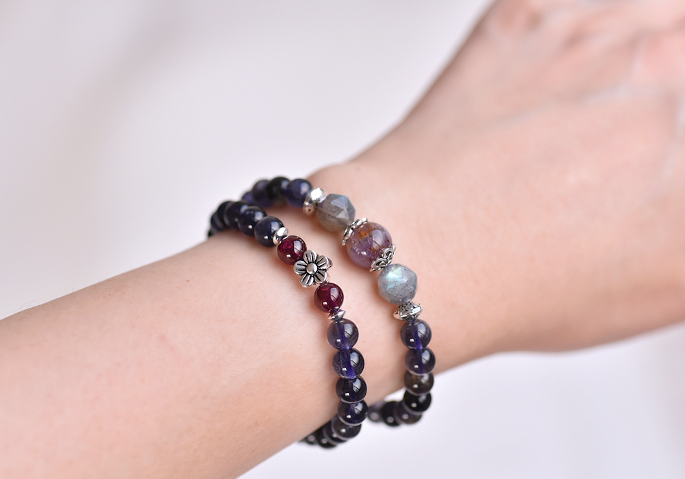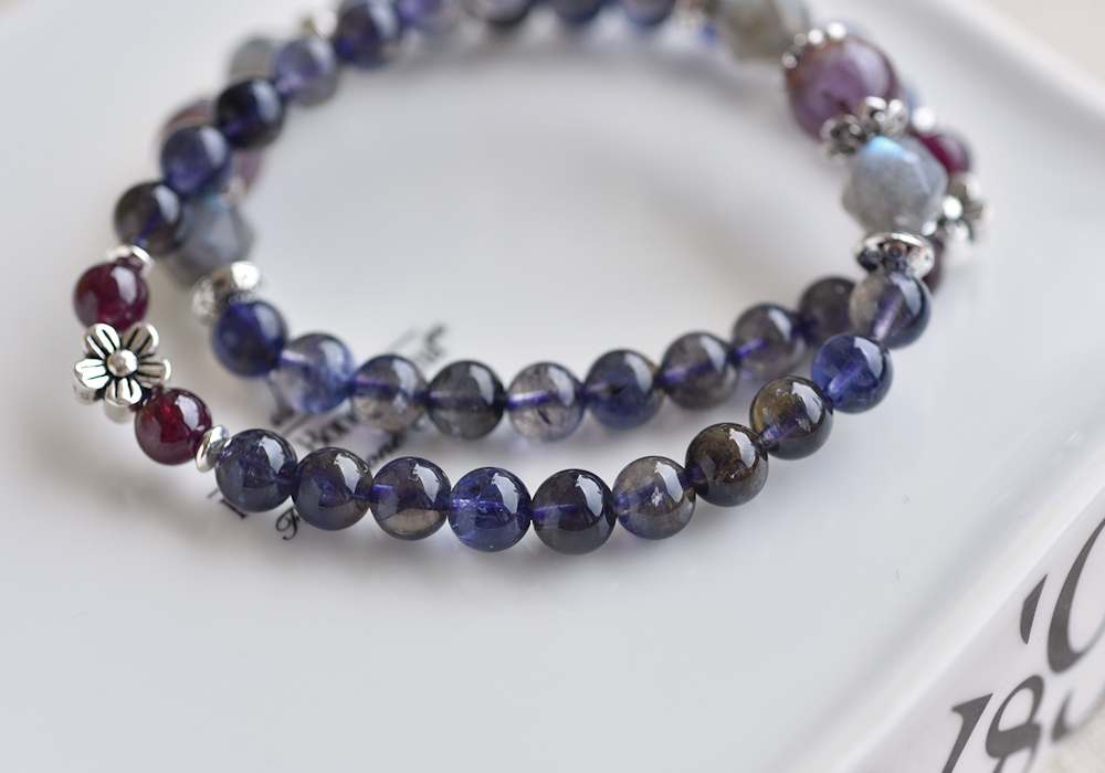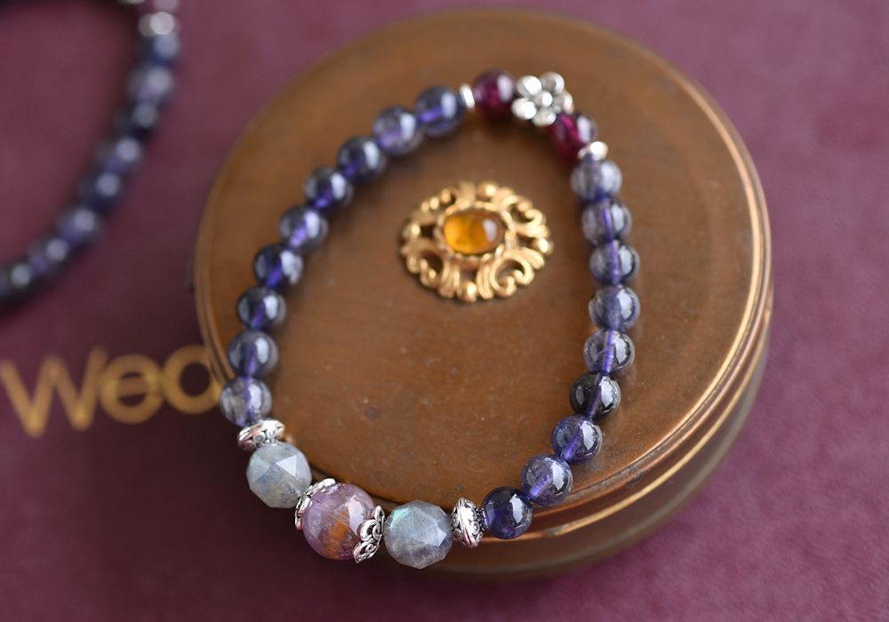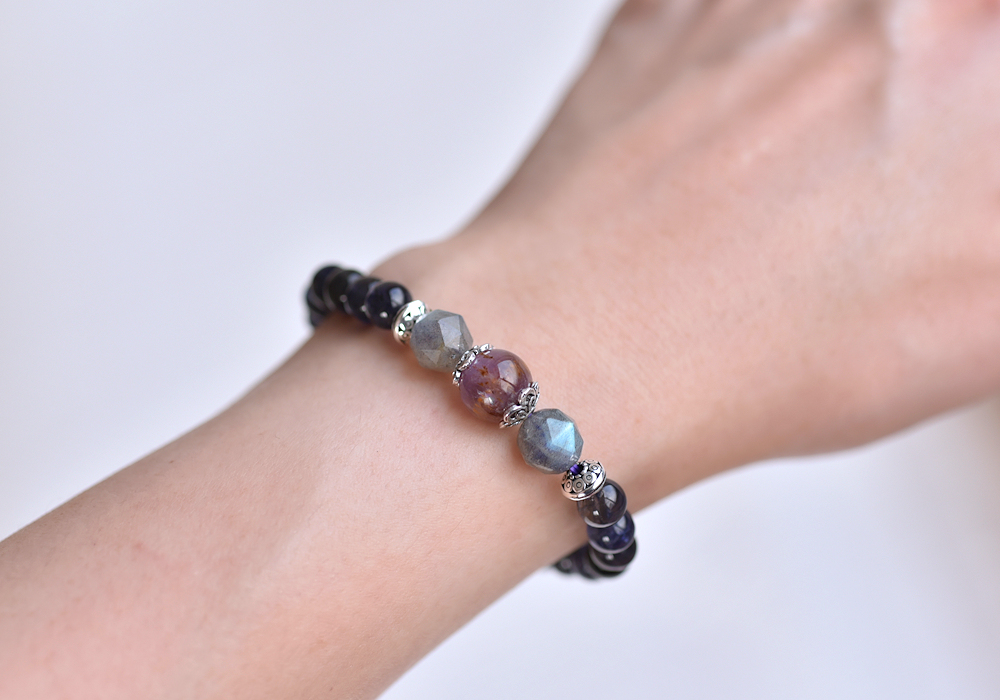 **堇青石+紫鈦晶+拉長石+石榴石純銀水晶手鍊**