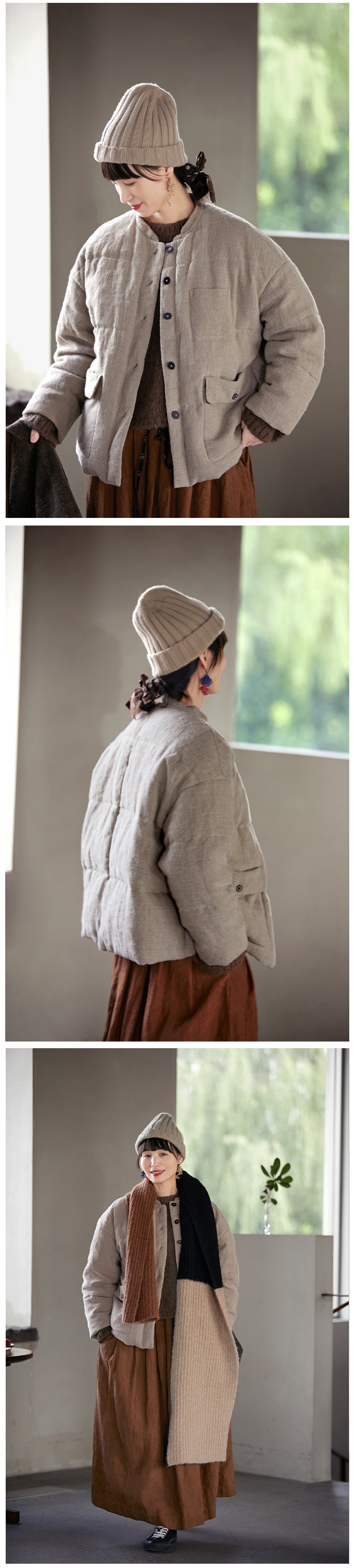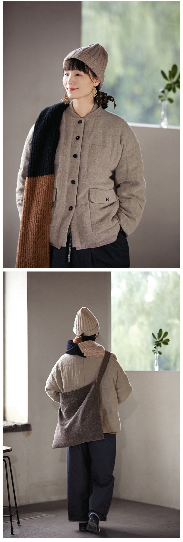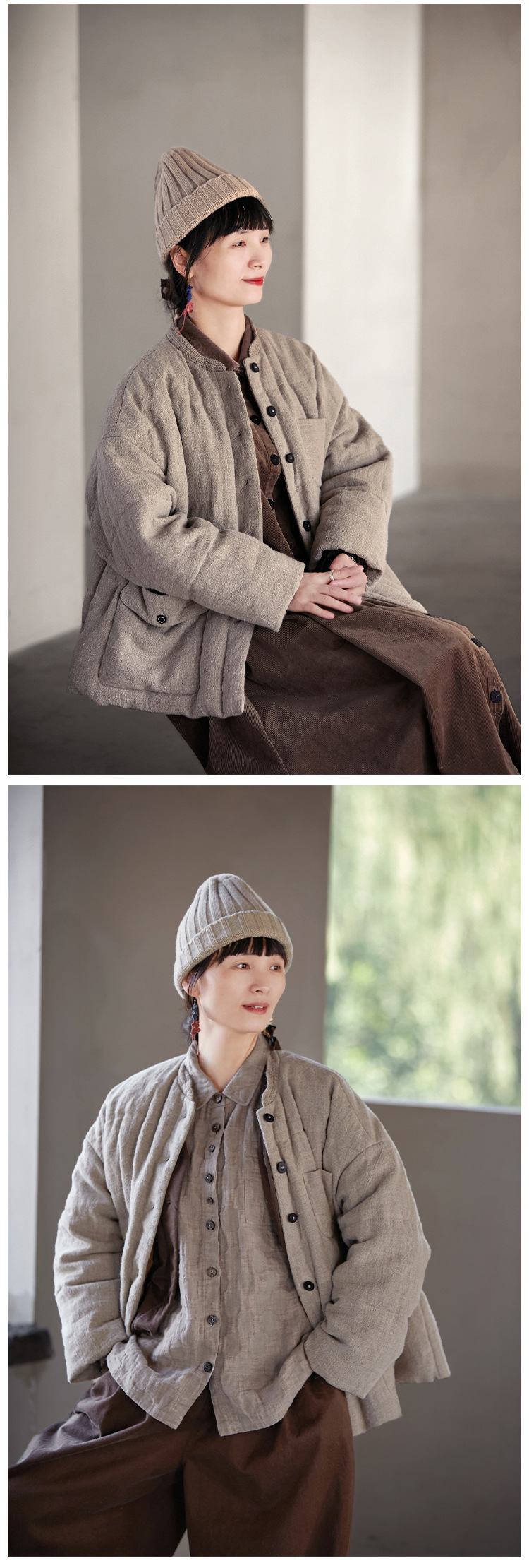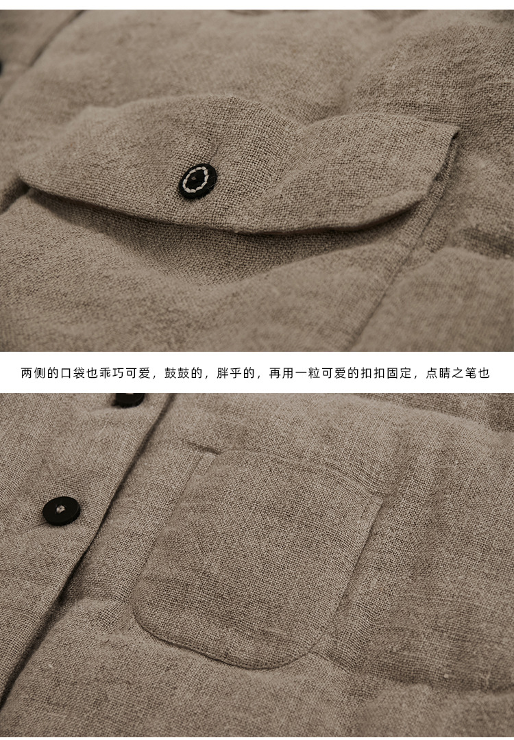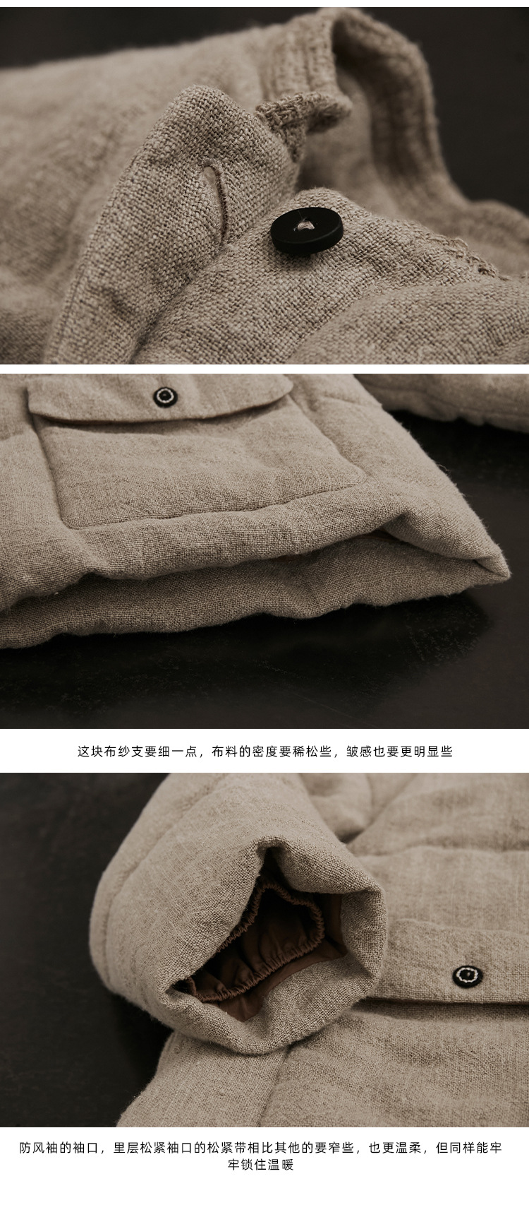 開門襟到底,斜向鎖扣眼,一些英氣所在,再結合溫潤有餘的皮扣,這俊俏就妥,皮與麻的結合也是相當的匹配。落肩式長袖,外套的標准,松量足夠下,依舊有溫暖的包裹感。防風袖的袖口,裡層松緊袖口的松緊帶相比其他的要窄些,也更溫柔,但同樣能牢牢鎖住溫暖,從外觀看,她看起來沒有過多的膨脹感,略有中性的立體,以及自然派的親和感。