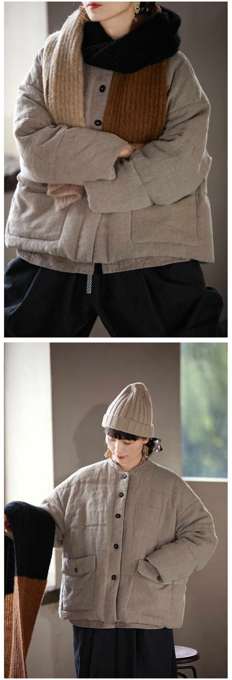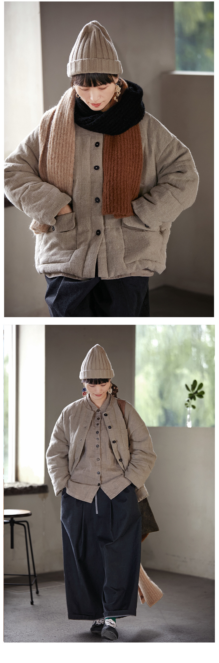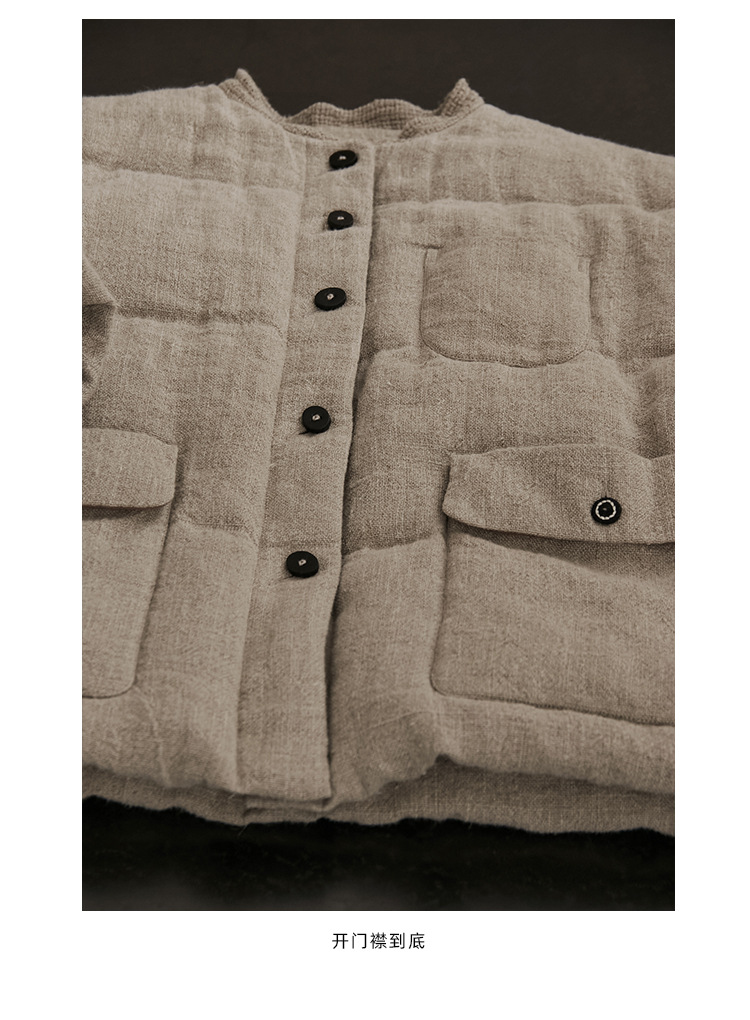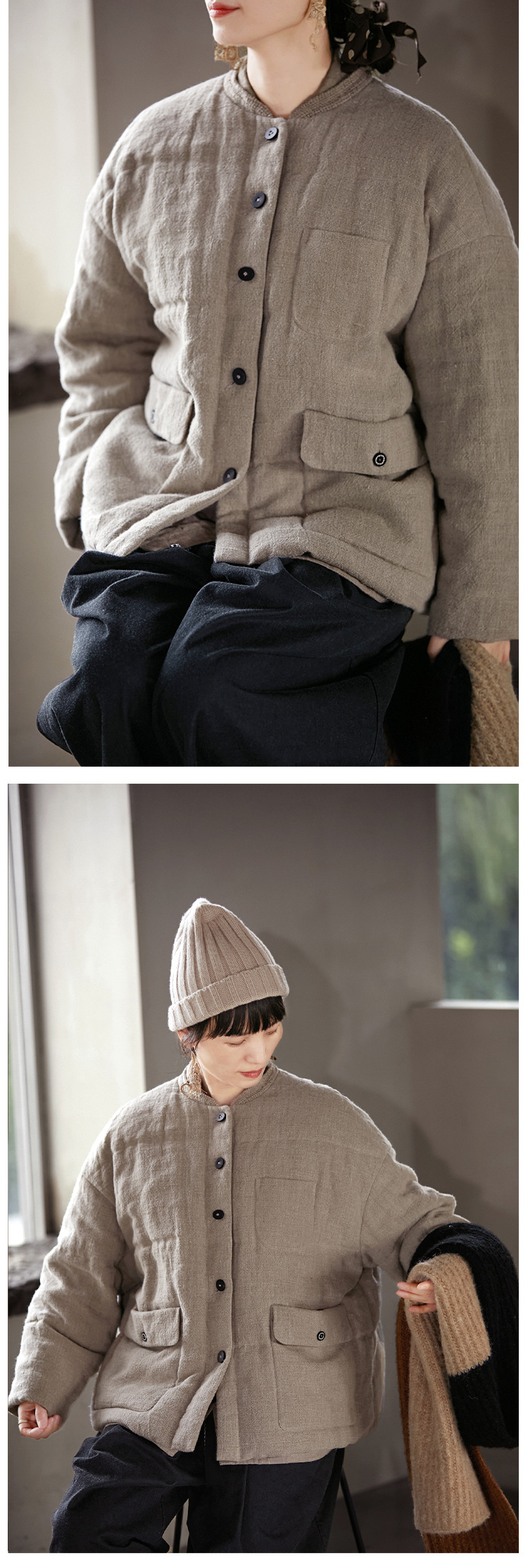 開門襟到底,斜向鎖扣眼,一些英氣所在,再結合溫潤有餘的皮扣,這俊俏就妥,皮與麻的結合也是相當的匹配。落肩式長袖,外套的標准,松量足夠下,依舊有溫暖的包裹感。防風袖的袖口,裡層松緊袖口的松緊帶相比其他的要窄些,也更溫柔,但同樣能牢牢鎖住溫暖,從外觀看,她看起來沒有過多的膨脹感,略有中性的立體,以及自然派的親和感。