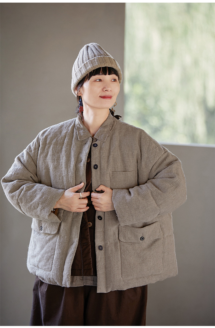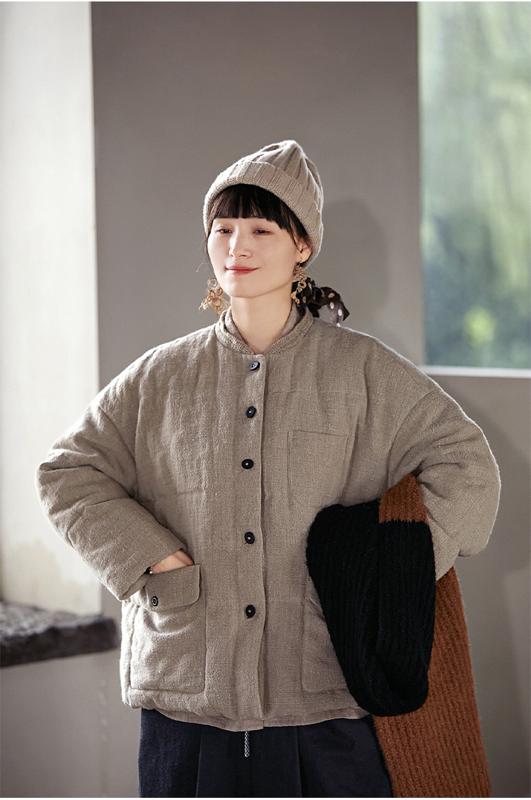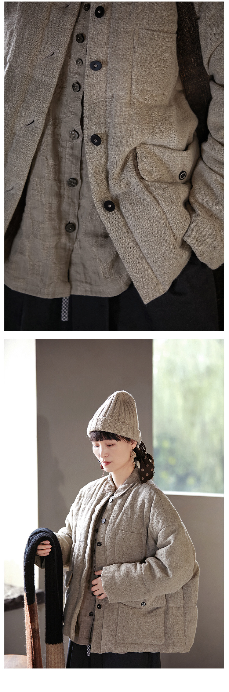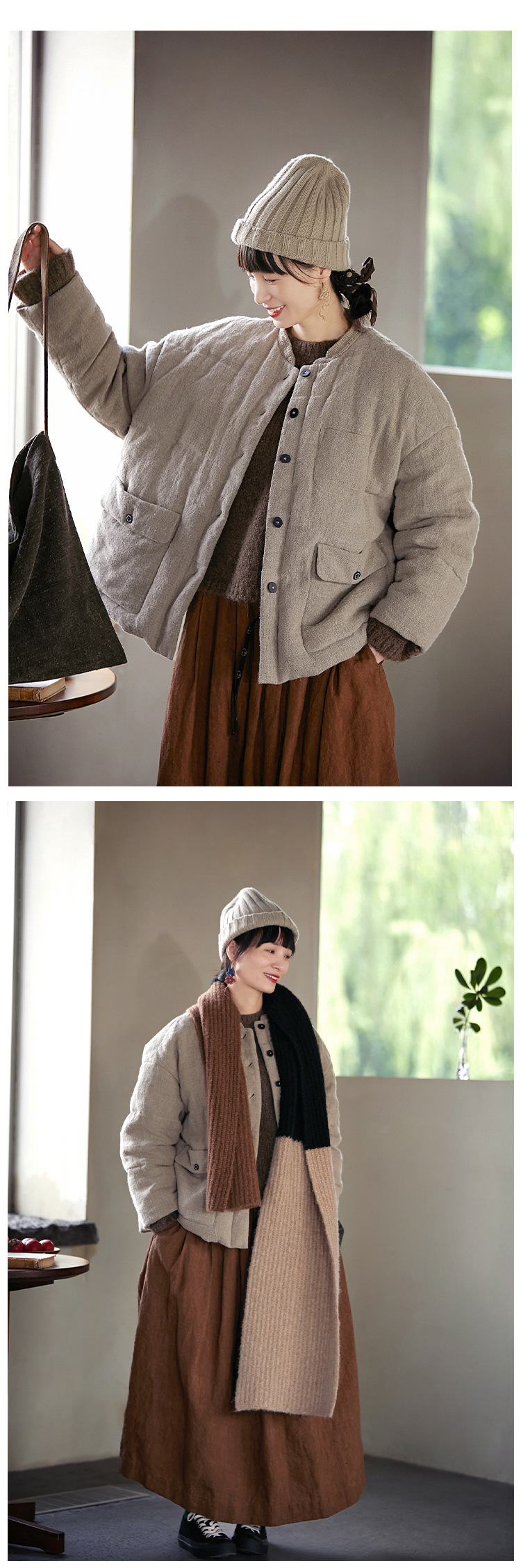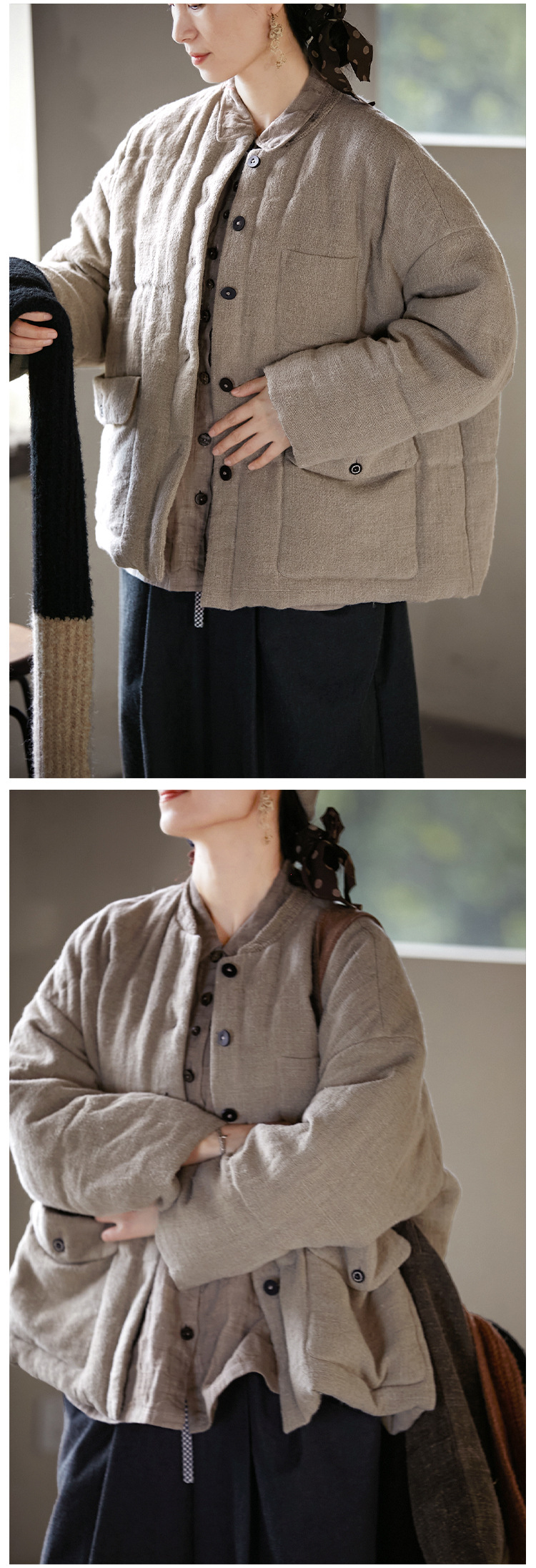 開門襟到底,斜向鎖扣眼,一些英氣所在,再結合溫潤有餘的皮扣,這俊俏就妥,皮與麻的結合也是相當的匹配。落肩式長袖,外套的標准,松量足夠下,依舊有溫暖的包裹感。防風袖的袖口,裡層松緊袖口的松緊帶相比其他的要窄些,也更溫柔,但同樣能牢牢鎖住溫暖,從外觀看,她看起來沒有過多的膨脹感,略有中性的立體,以及自然派的親和感。