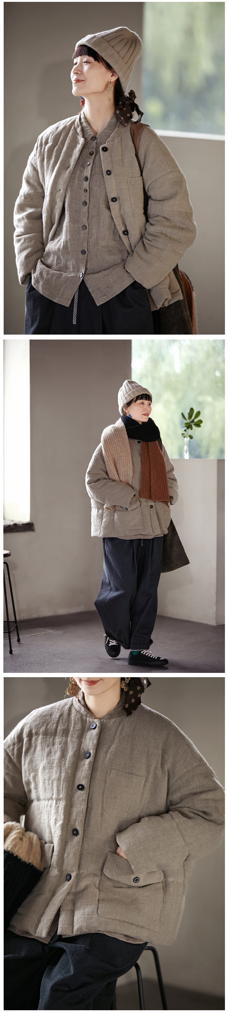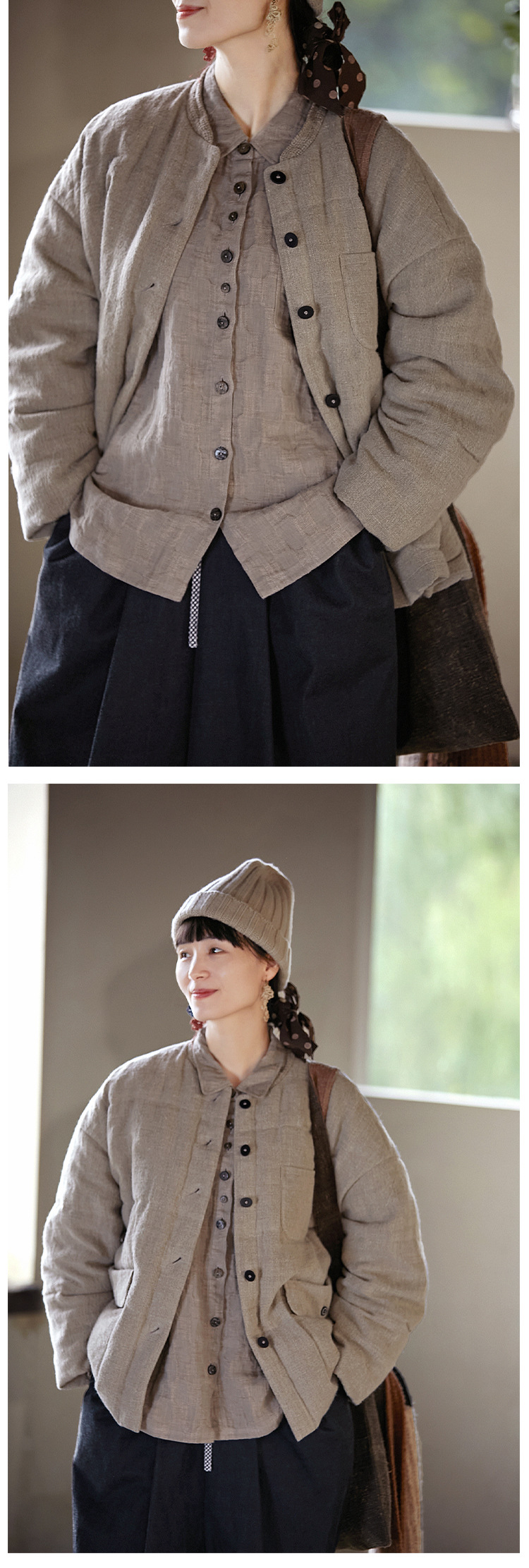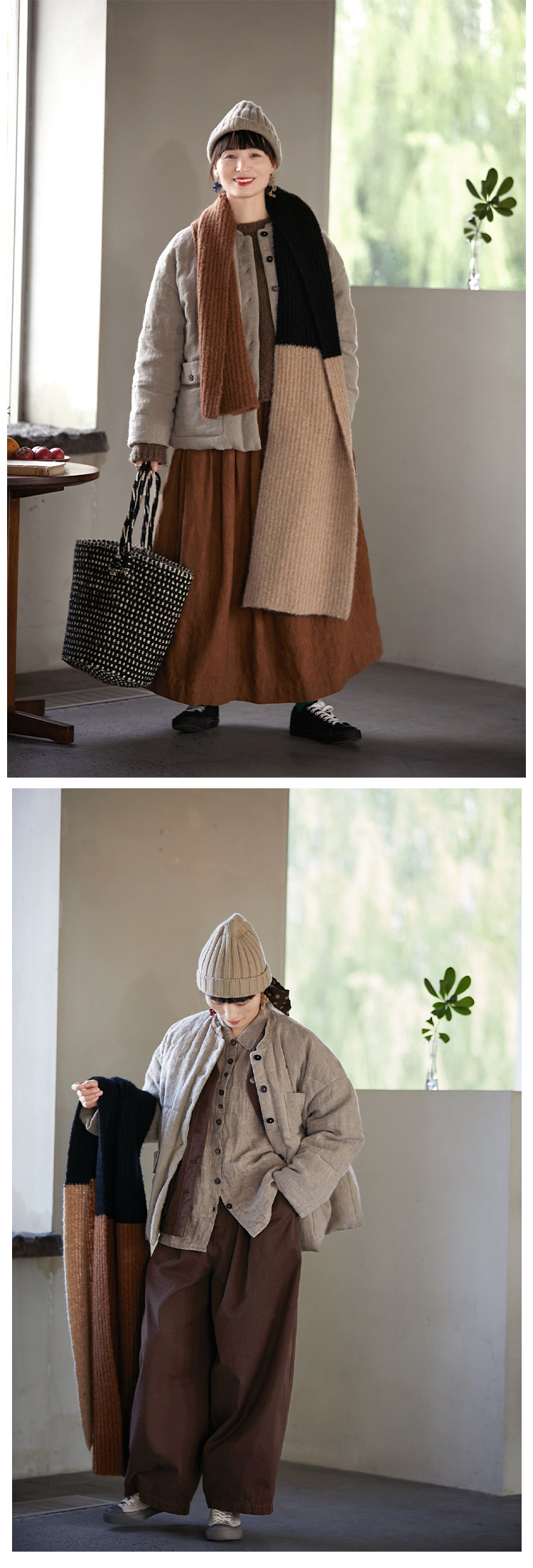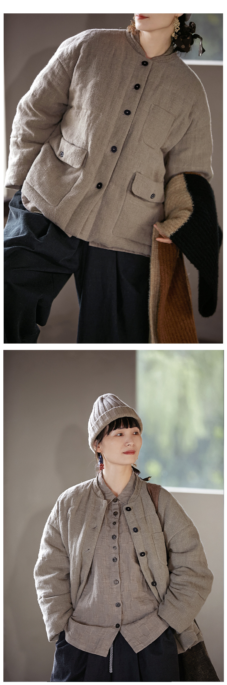 開門襟到底,斜向鎖扣眼,一些英氣所在,再結合溫潤有餘的皮扣,這俊俏就妥,皮與麻的結合也是相當的匹配。落肩式長袖,外套的標准,松量足夠下,依舊有溫暖的包裹感。防風袖的袖口,裡層松緊袖口的松緊帶相比其他的要窄些,也更溫柔,但同樣能牢牢鎖住溫暖,從外觀看,她看起來沒有過多的膨脹感,略有中性的立體,以及自然派的親和感。