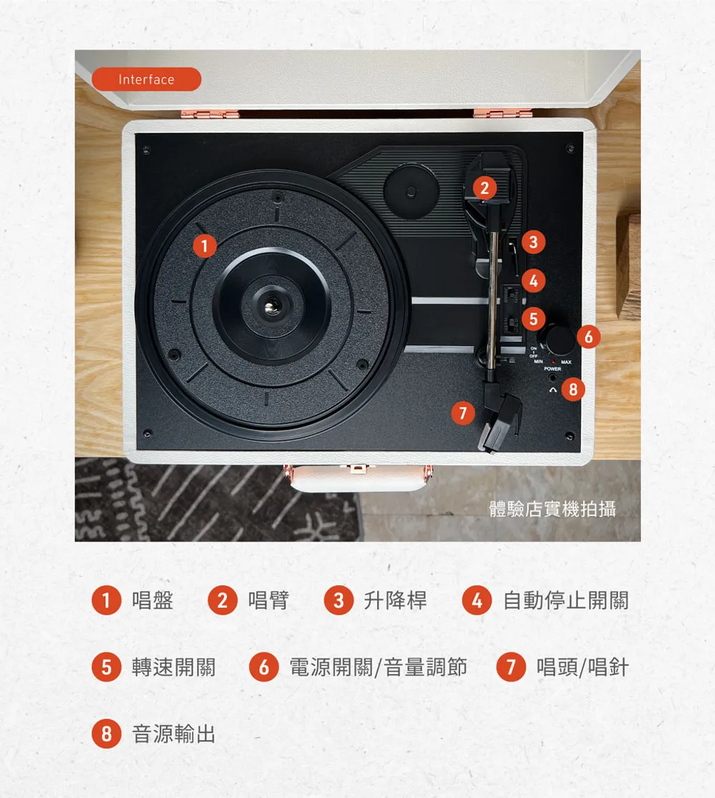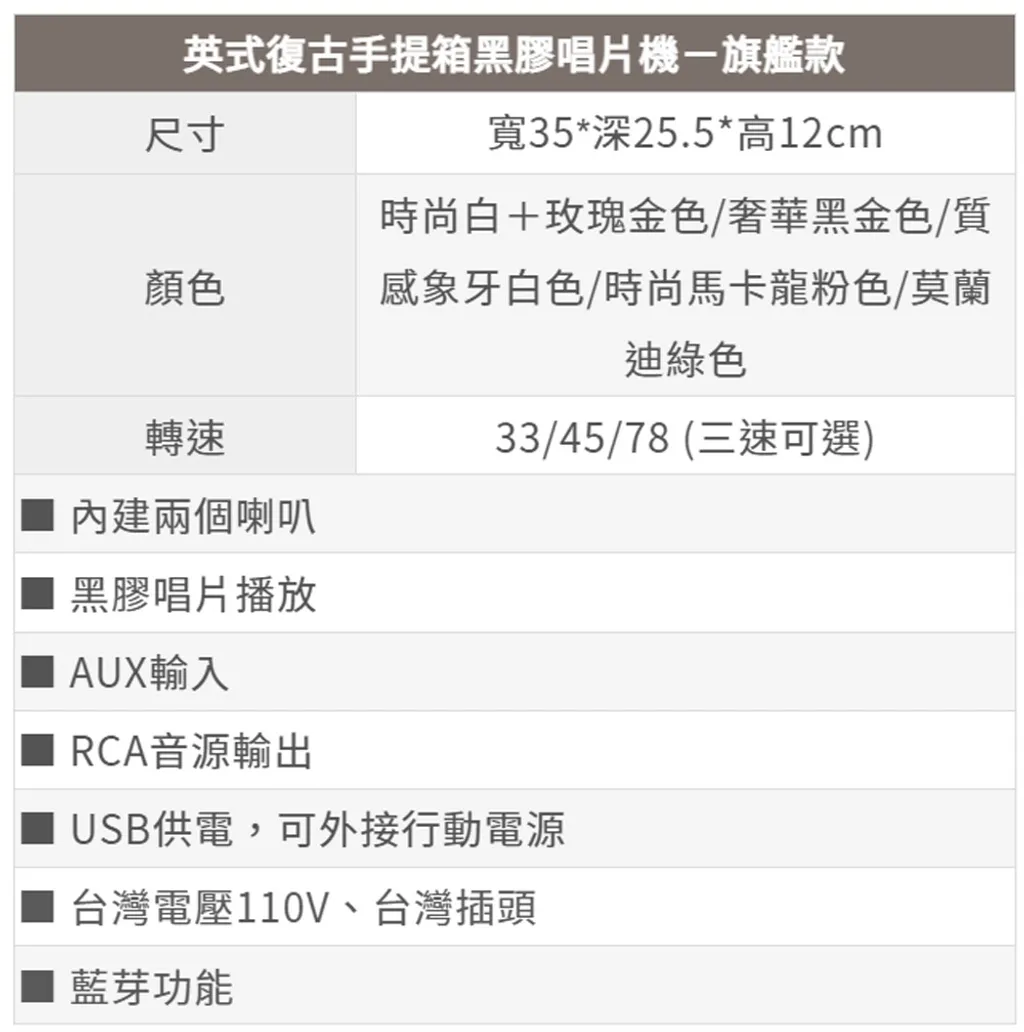 機身配置:紅寶石唱針,支援 33/45/78 rpm,3個轉速