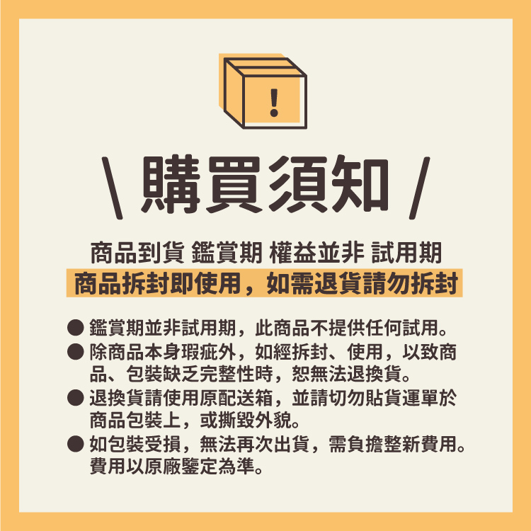 1. 商品到貨享猶豫期之權益並非【試用期】,除商品本身瑕疵外,如經拆封、使用,以致缺乏完整性時,恕無法退換貨。