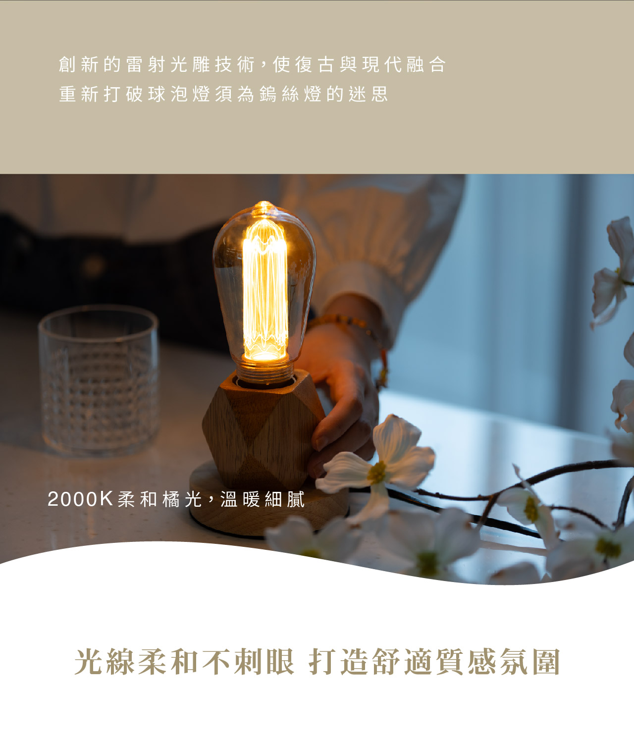 溫和的光線 - 溫暖柔和的2000K橘光融入環境,打造質感氛圍的空間,柔和不刺眼能舒適地好好放鬆。