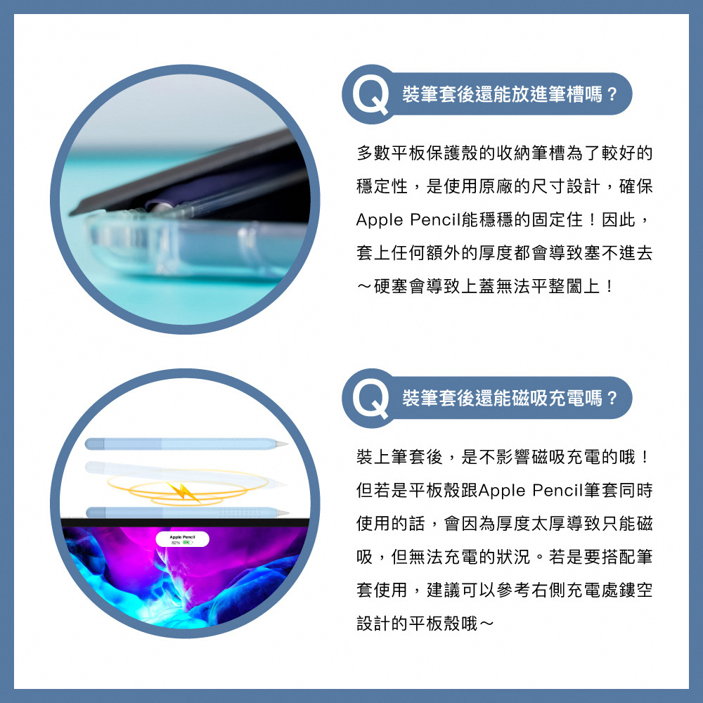 A:若Apple Pencil為裸筆使用,沒有裝筆套等任何厚度配件的狀態,不會影響到磁吸充電的功能;但Apple Pencil裝上筆套後,會因為平板殼厚度加上筆套的厚度過厚,影響到磁吸充電的功能哦!