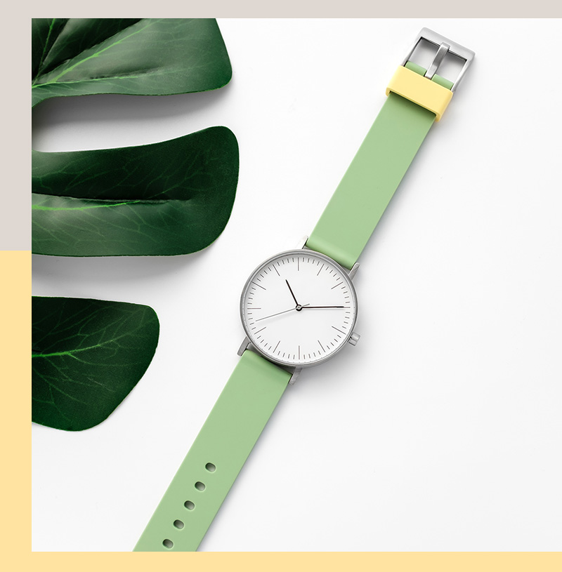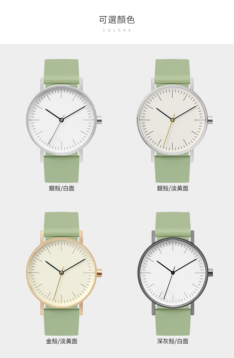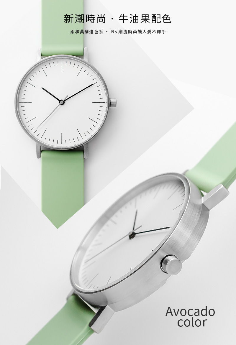 拉絲質感表殼,搭配極簡刻度設計,可愛風格牛油果色表帶,36/40MM兩個表盤尺寸可供選擇。