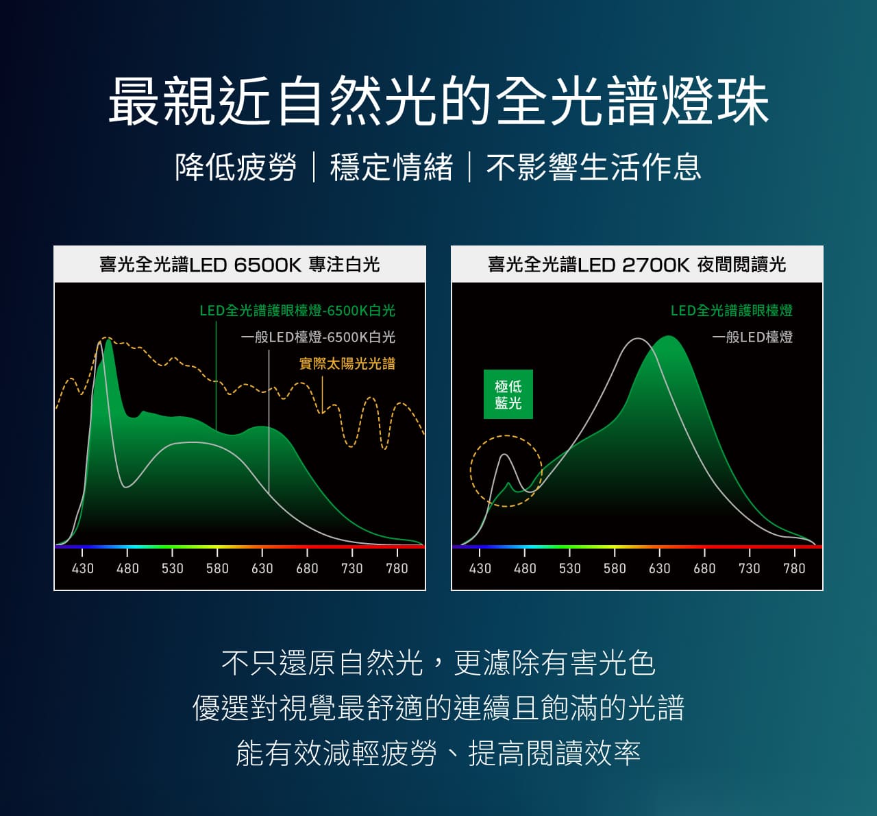 全光譜護眼檯燈是一盞最接近大自然的燈,模擬太陽光環境的顯色飽滿度。從太陽升起到日落,相繼調整為合適的色溫及亮度。「以人為本」的設計,更能配合使用者的作息規律。